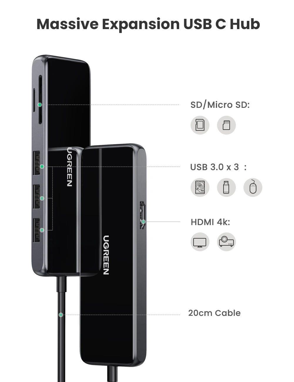 1. Hub USB C mở rộng khối lượng lớn: UGREEN USB C Hub cung cấp giải pháp đơn giản để nâng cấp PC của bạn, mở rộng Cổng 3xUSB 3.0, Gigabit Ethernet và cổng sạc