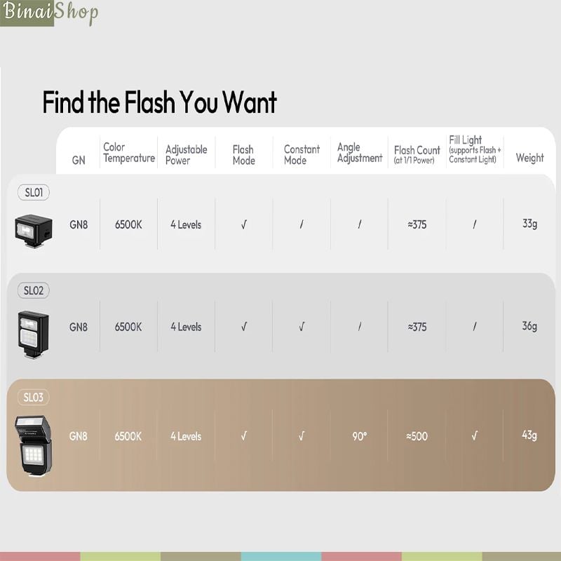 - Điều chỉnh dễ dàng, chuyển đổi giữa các chế độ ánh sáng chỉ bằng một nút bấm: SL01: chế độ flash cơ bản, SL02: nhấn và giữ nút MODE để chuyển đổi giữa chế độ đèn flash và đèn sáng liên tục và SL03: nâng cấp thêm 3 chế độ: Flash, Constant Light, và Hybrid (Flash + LED), kèm đầu flash xoay nghiêng 90° cho phép bounce flash linh hoạt.