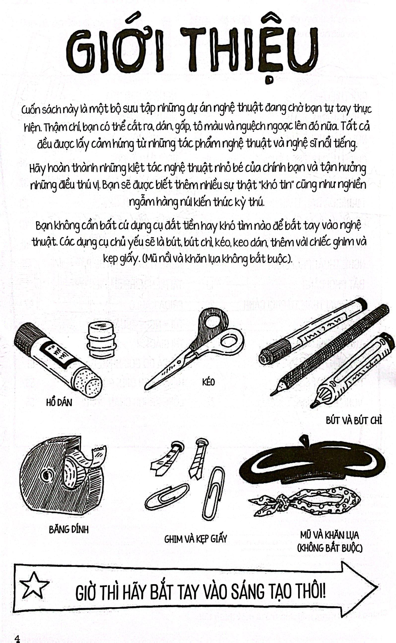 Cuốn Nghệ thuật giới thiệu với trẻ về nghệ thuật với sự dẫn dắt của các nghệ sĩ thiên tài. Lấy cảm hứng từ những tác phẩm nghệ thuật và nghệ sĩ nổi tiếng, trẻ thực hiện các dự án nghệ thuật bằng việc cắt ghép, tô vẽ… các trang sách, từ đó biết thêm những sự thật “khó tin” cũng như về bản thân nghệ sĩ.