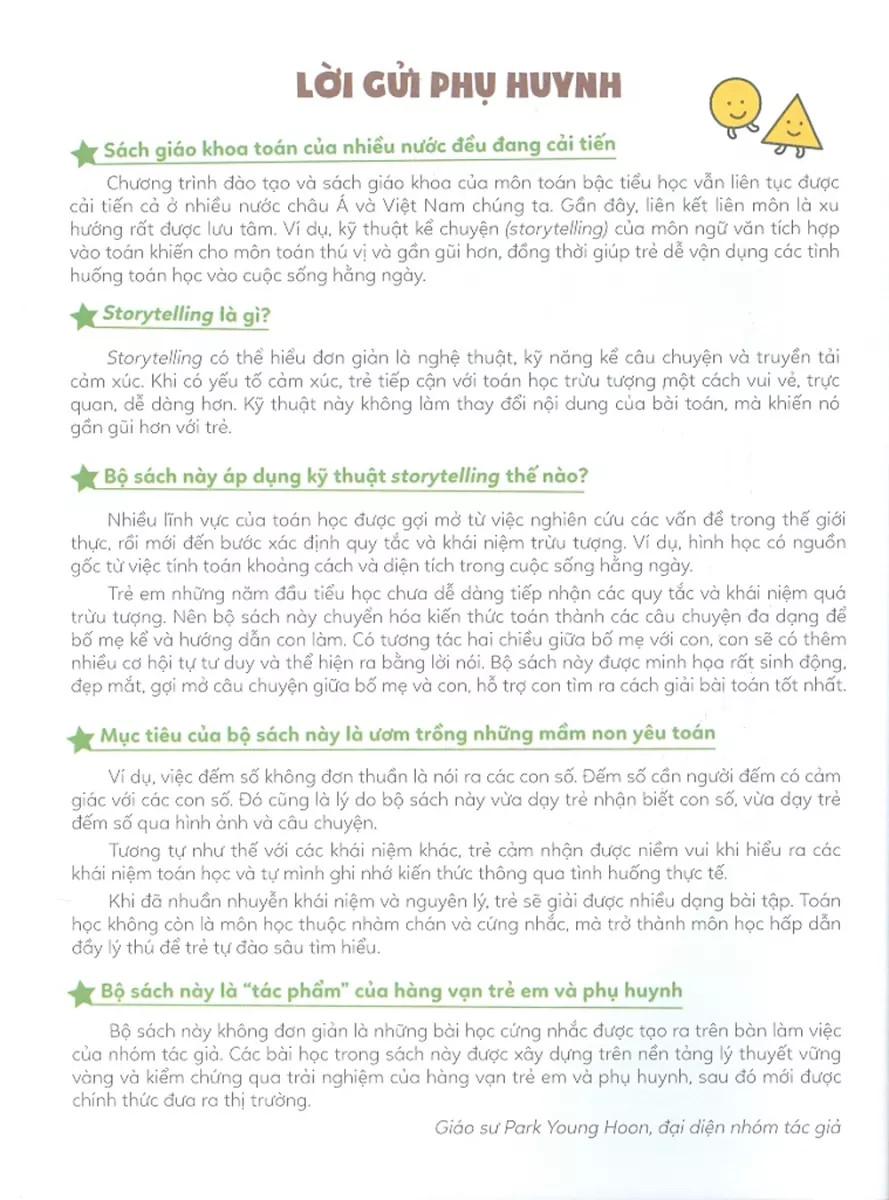 Trẻ em ở tuổi sắp đi học và những năm đầu tiểu học khó tiếp thu các quy tắc và khái niệm quá trừu tượng. Bộ sách này chuyển hóa kiến thức toán thành các câu chuyện đa dạng có minh họa để bố mẹ dễ làm cùng trẻ. Được tương tác hai chiều với bố mẹ, trẻ sẽ có thêm nhiều cơ hội tự tư duy và thể hiện ra bằng lời nói.