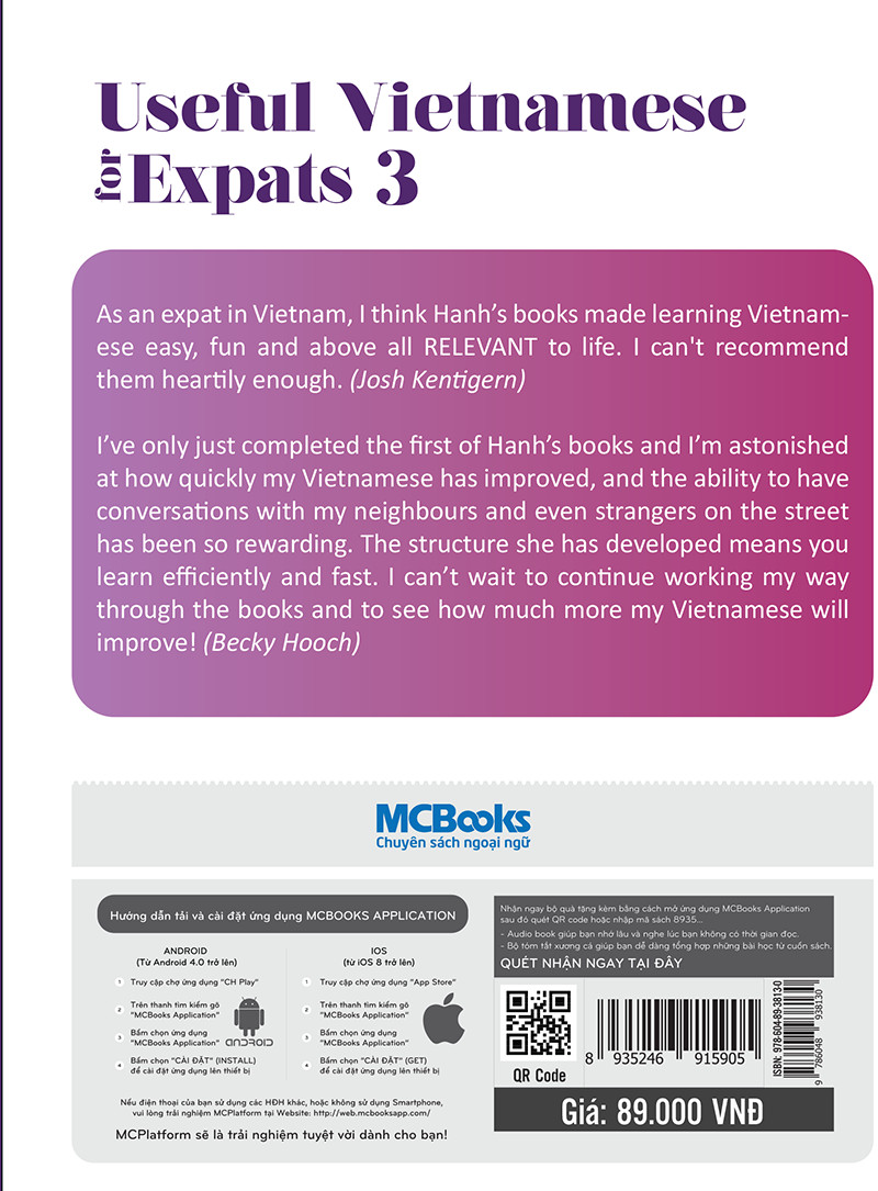 Ngay cả khi bạn đã nắm chắc toàn bộ những kiến thức ngữ pháp tiếng Việt, nhưng bạn còn băn khoăn rằng làm cách nào để có thể giao tiếp một cách trôi chảy nhất có thể vì có biết bao tình huống bạn phải đối mặt hàng ngày. Nếu bạn đã hoàn thành xong hai cấp độ trước của bộ sách này thì cuốn sách Useful Vietnamese for Expats 3 sẽ giúp bạn tiếp cận một cách gần nhất những vấn đề để dễ dàng gợi mở cuộc trò chuyện.