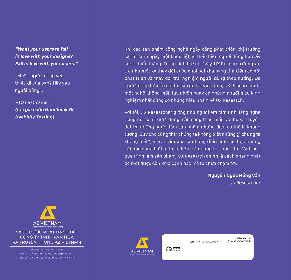 Nếu bạn muốn trở thành người có “nghề”, có kiến thức, trau dồi thêm kinh nghiệm trong lĩnh vực UX Research thì cuốn sách UX RESEARCH – Thấu hiểu người dùng, ung dung chiến thắng sẽ giải cơn khát “làm nghề”, mong muốn “phụng sự khách hàng”. Bằng vốn kinh nghiệm thực tiễn, hai chuyên gia về UX - Khúc Cẩm Huyên và Đỗ Thùy Linh chia sẻ về những bí quyết nghề nghiệp, làm thế nào để “hiểu” và “thương” khách hàng. Vốn kiến thức, tư tưởng, cách tiếp cận trong cuốn sách này đảm bảo vừa thực tiễn vừa hữu ích sẽ giúp những người làm nghề UX Research học được cách thấu hiểu người dùng nhằm phục vụ trong công việc và kinh doanh. Bên cạnh đó, cuốn sách còn đưa ra định hướng theo đuổi nghề nghiệp mới rất thú vị và quan trọng trong ngành UX.