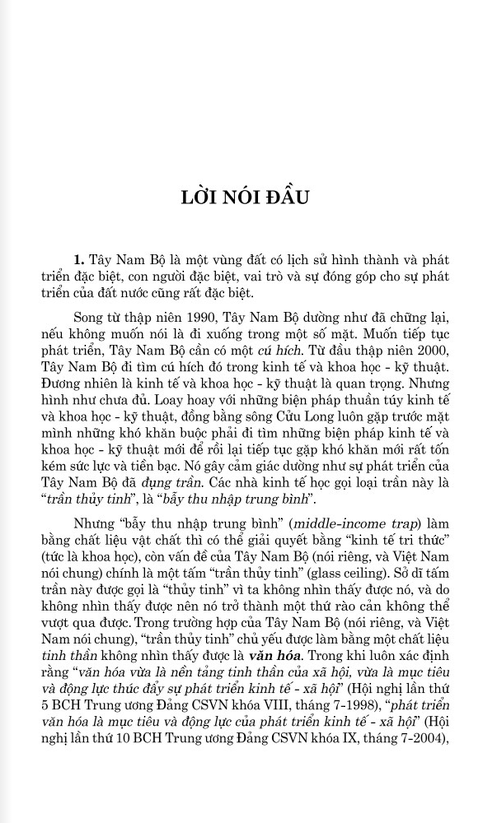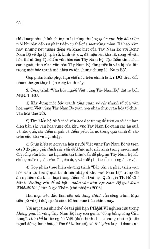 Văn Hóa Người Việt Vùng Tây Nam Bộ (2022) Tây Nam Bộ là một vùng đất có lịch sử hình thành và phát triển đặc biệt, con người đặc biệt, vai trò và sự đóng góp cho sự phát triển của đất nước cũng rất đặc biệt. Song từ thập nin 1990, Tây Nam Bộ dường như đã chững lại, nếu không muốn nói là đi xuống trong một số mặt. Muốn tiếp tục phát triển, Tây Nam Bộ cần có một cú hích. Từ đầu thập niên 2000, Tây Nam Bộ đi tìm cú hích đó trong kinh tế và khoa học - kỹ thuật. Đương nhiên là kinh tế và khoa học - kỹ thuật là quan trọng. Nhưng hình như chưa đủ. Loay hoay với những biện pháp thuần túy kinh tế và khoa học - kỹ thuật, đồng bằng sông Cửu Long luôn gặp trước mặt mình những khó khăn buộc phải đi tìm những biện pháp kinh tế và khoa học - kỹ thuật mới để rồi lại tiếp tục gặp khó khăn mới rất tốn kém sức lực và tiền bạc. Nó gây cảm giác dường như sự phát triển của Tây Nam Bộ đã đụng trần. Các nhà kinh tế học gọi loại trần này là “trần thủy tinh” (glass ceiling), l “bẫy thu nhập trung bình” (middle-income trap). Nhưng “bẫy thu nhập trung bình” thì có thể giải quyết bằng “kinh tế tri thức” (tức là khoa học), còn tấm trần này sở dĩ là “thủy tinh” không nhìn thấy được , có lẽ là vì nó chủ yếu được làm bằng một chất liệu tinh thần là văn hóa. Trong khi ta luôn xác định rằng “văn hóa vừa là nền tảng tinh thần của xã hội, vừa là mục tiêu và động lực thúc đẩy sự phát triển kinh tế - xã hội” (Hội nghị lần thứ 5 BCH Trung ương Đảng Cộng sản Việt Nam khóa VIII, tháng 7-1998), “phát triển văn hóa là mục tiêu và động lực của phát triển kinh tế - xã hội” (Hội nghị lần thứ 10 BCH Trung ương Đảng Cộng sản Việt Nam khóa IX, tháng 7-2004), thì dường như chính chúng ta lại cũng thường quên văn hóa đầu tiên mỗi khi bàn đến sự phát triển cụ thể của một vùng miền. Đã bao năm nay, những nét tương đồng và khác biệt của Tây Nam Bộ với Đông Nam Bộ về địa lý, lịch sử, kinh tế, , đã hiện lên khá rõ, song về văn hóa thì những đặc điểm văn hóa của Tây Nam Bộ, đặc điểm tính cách con người, tính cách văn hóa Tây Nam Bộ đáng tiếc là vẫn bị hòa lẫn trong trong một bức tranh mờ nhòa có tên chung chung là “Nam Bộ”. Góp phần khắc phục hạn chế nêu trên chính là LÝ DO thúc đẩy nhóm tác giả thực hiện công trình này. Công trình “Văn hóa người Việt vùng Tây Nam Bộ” đặt ra bốn MỤC TIÊU:
