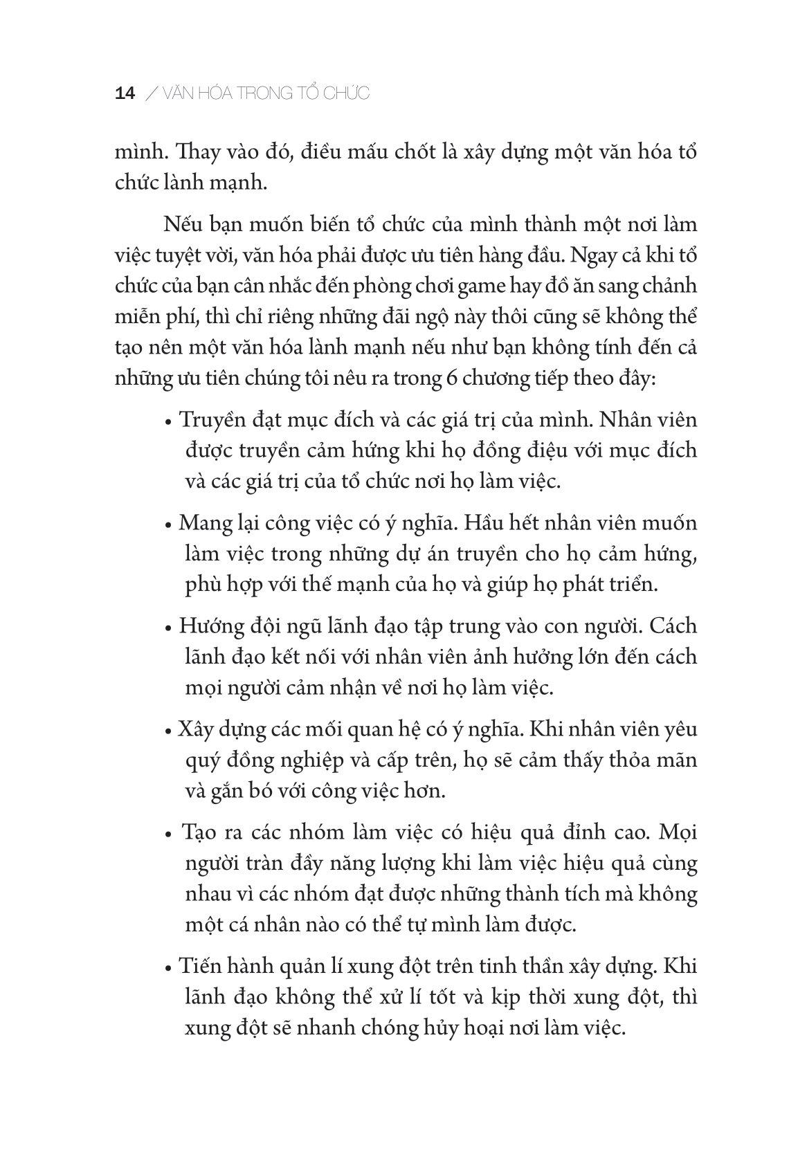 Với cuốn sách này, bạn sẽ: KHÁM PHÁ 6 YẾU TÔ CƠ BẢN TẠO NÊN MỘT VĂN HÓA TỔ CHỨC LÀNH MẠNH Văn hóa tổ chức là gì? Hầu hết chúng ta đều biết những câu chuyện từ một số nơi “tuyệt nhất” để làm việc – những Google của thế giới, với những khu ăn uống đáng ngưỡng mộ, những tòa nhà lộng lẫy, dịch vụ mát-xa miễn phí và những bàn chơi bi lắc. Những người ra quyết định ở nhiều công ty kể trên có thể cảm thấy các đãi ngộ thêm này sẽ giúp tổ chức của mình trở thành nơi làm việc tuyệt vời, và kết quả là họ sẽ thu hút cũng như giữ chân được những nhân viên tài năng, nhiệt tình, hiệu quả. Những sáng kiến này nghe có vẻ tuyệt vời, và quả thực chúng có thể giúp tạo ra nhiều tổ chức vui vẻ và hiệu quả hơn. Tuy nhiên, thực tế là hầu hết các công ty không có đủ nguồn lực để triển khai những chương trình kiểu này. Điều đáng mừng là, dù nghe có vẻ hay ho song những đãi ngộ này không thực sự cần thiết để thu hút được những nhân viên hiệu quả và tận tâm, những người yêu thích công việc và trung thành với tổ chức mình. Thay vào đó, điều mấu chốt là xây dựng một văn hóa tổ chức lành mạnh. Xây dựng văn hóa trong tổ chức như thế nào? Nếu bạn muốn biến tổ chức của mình thành một nơi làm việc tuyệt vời, văn hóa phải được ưu tiên hàng đầu. Ngay cả khi tổ chức của bạn cân nhắc đến phòng chơi game hay đồ ăn sang chảnh miễn phí, thì chỉ riêng những đãi ngộ này thôi cũng sẽ không thể tạo nên một văn hóa lành mạnh nếu như bạn không tính đến cả những ưu tiên được nêu ra trong 6 chương của cuốn sách: Truyền đạt mục đích & các giá trị của mình. Nhân viên được truyền cảm hứng khi họ đồng điệu với mục đích và các giá trị của tổ chức nơi họ làm việc. Mang lại công việc có ý nghĩa. Hầu hết nhân viên muốn làm việc trong những dự án truyền cho họ cảm hứng, phù hợp với thế mạnh của họ và giúp họ phát triển. Hướng đội ngũ lãnh đạo tập trung vào con người. Cách lãnh đạo kết nối với nhân viên ảnh hưởng lớn đến cách mọi người cảm nhận về nơi họ làm việc. Xây dựng các mối quan hệ có ý nghĩa. Khi nhân viên yêu quý đồng nghiệp và cấp trên, họ sẽ cảm thấy thỏa mãn và gắn bó với công việc hơn. Tạo ra các nhóm làm việc có hiệu quả đỉnh cao. Mọi người tràn đầy năng lượng khi làm việc hiệu quả cùng nhau vì các nhóm đạt được những thành tích mà không một cá nhân nào có thể tự mình làm được. Tiến hành quản lí xung đột trên tinh thần xây dựng. Khi lãnh đạo không thể xử lí tốt và kịp thời xung đột, thì xung đột sẽ nhanh chóng hủy hoại nơi làm việc. Văn hóa tổ chức là yếu tố quan trọng nhất ảnh hưởng đến hạnh phúc, các mối quan hệ công việc và mức độ hài lòng với công việc. Hiểu rõ văn hóa tổ chức là gì và văn hóa tổ chức của chính nơi bạn làm việc là gì sẽ giúp bạn dễ dàng xác định các vấn đề và phát triển các chiến lược để tạo nên một văn hóa tốt đẹp hơn, đồng thời tận dụng được năng lượng tích cực của văn hóa đó. Văn hóa tổ chức bao gồm các yếu tố như giá trị, sứ mệnh, phong cách lãnh đạo, kì vọng vào cách nhân viên cư xử với khách hàng và cư xử với nhau. Văn hóa hiện hữu qua cách con người tương tác với nhau – hành vi của họ. Văn hóa được phản ảnh qua cách mọi việc được hoàn thành. Văn hóa cấu tạo từ những nguyên tắc và chuẩn mực gắn kết tổ chức lại thành một khối. CUỐN SÁCH NÀY DÀNH CHO AI? Nếu đã chọn cuốn sách này, thì nhiều khả năng bạn đang không hài lòng với văn hóa tổ chức của mình, hoặc có thể bạn nghĩ rằng ít ra văn hóa ấy có thể trở nên tốt hơn so với hiện tại. Nếu trong thâm tâm bạn nghĩ rằng có một cách tốt hơn, rằng mọi thứ không thể cứ mãi thế này được, thì cuốn sách này là dành cho bạn. Nếu bạn lờ mờ nhận ra điều gì đó nhưng không biết chắc cách để tác động đến sự thay đổi văn hóa tại nơi làm việc của mình, thì cuốn sách này là dành cho bạn. Nếu bạn là một trong những cá nhân may mắn được làm việc trong một tổ chức có văn hóa mạnh mẽ, nhưng lại không biết chắc cách để duy trì sức mạnh đó khi bạn phát triển, thay đổi và đối mặt với tương lai, thì cuốn sách này là dành cho bạn. Nếu bạn là một nhà lãnh đạo muốn chủ động trau dồi một văn hóa tổ chức lành mạnh, thì cuốn sách này là dành cho bạn. Lãnh đạo chịu phần lớn trách nhiệm cho tình trạng của văn hóa tổ chức, nhưng mọi người ở tổ chức đều có một vai trò trong việc tác động và duy trì văn hóa đó. Xuyên suốt cuốn sách, chúng tôi sử dụng cụm từ “nhà lãnh đạo” theo nghĩa bao hàm để chỉ tất cả những người có ảnh hưởng đến người khác tại nơi làm việc. Cuốn sách này có thể áp dụng cho người giám sát, quản lí, giám đốc, quản lí nhân sự, đại biểu công đoàn và những