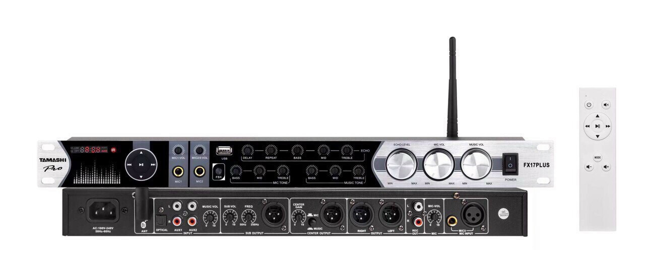 - Về tính năng của vang cơ TAMASHI FX 17 PLUS không chỉ có thiết kế thông minh, thân thiện với người dùng mà còn sở hữu nhiều tính năng vượt trội như: kết nối không dây bluetooth + giải mã tính hiệu số cổng quang + hỗ trợ usb TAMASHI FX 17 PLUS có tính năng như một cossiver cơ tách và điều khiển tín hiệu cho loa trầm , và loa center Khả năng triệt tiêu hú rít cực tốt: Được trang bị mạch chống hú feedback với công nghệ dịch tần số giúp giảm tình trạng hú rít lên đến 90% mà không gây ảnh hưởng tới chất lượng âm thanh. Hơn nữa TAMASHI FX 17 PLUS còn có khả năng giảm ồn mang tới âm thanh sạch nhất khi sử dụng. đi cùng là 2 ic TM nổi tiếng về khae năng sủ lý mang lại tiếng echo mềm mịn , đỡ giọng hát nhẹ nhàng , bay bổng hơn.