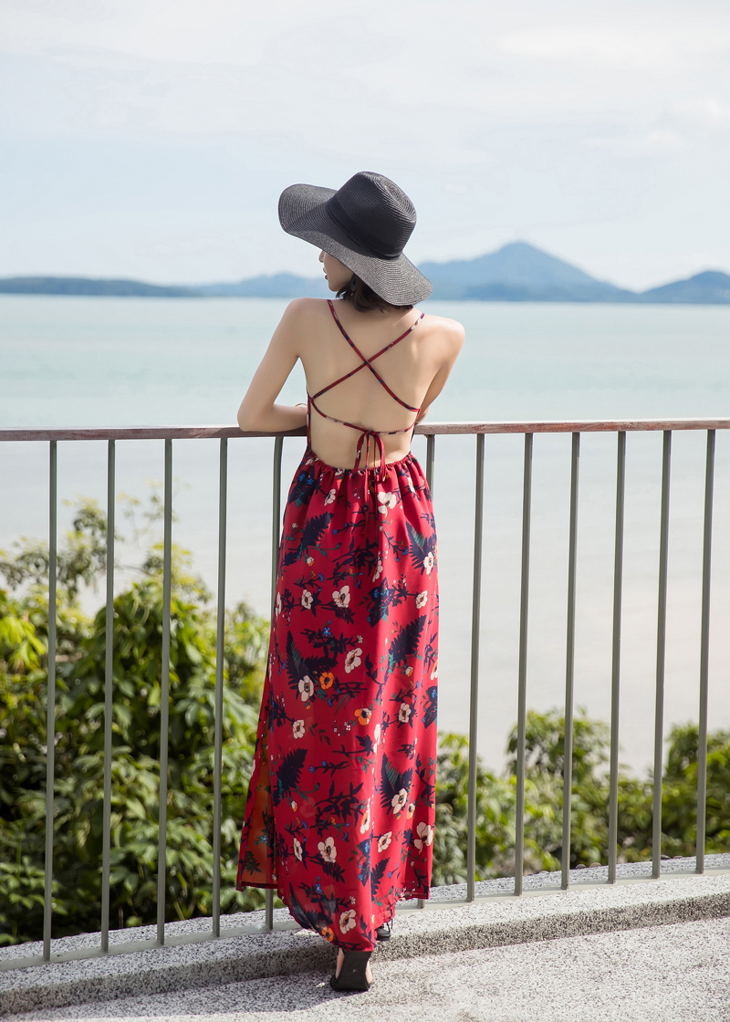 ✨Váy maxi 2 dây lưng trần sexy, họa tiết trang nhã, thích hợp đi biển, dạ hội, sự kiện