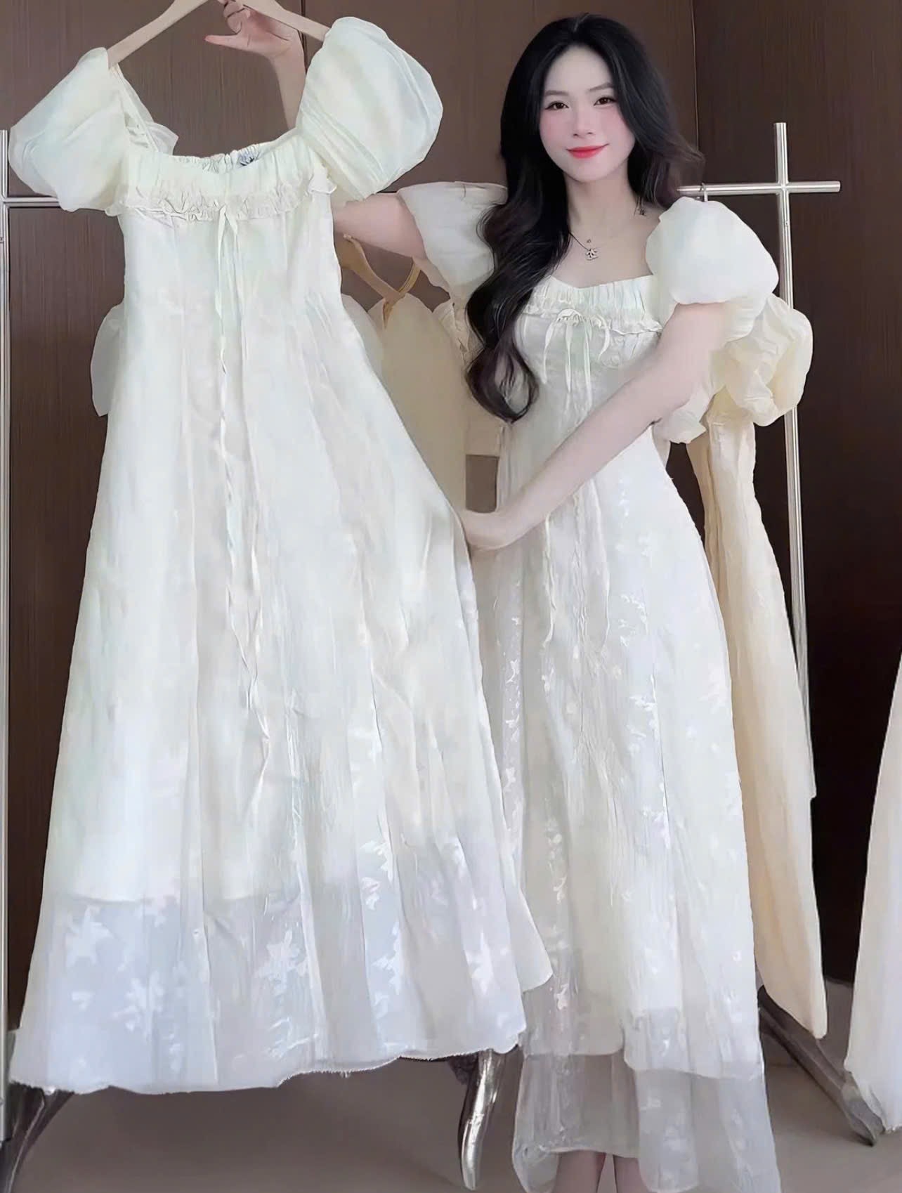 D4980] Váy thiết kế ren cúc bọc tay bồng pha chân tơ dáng dài Shop về 2 size S.M 2 màu trắng và kem Sản phẩm này là tài sản cá nhân được bán bởi