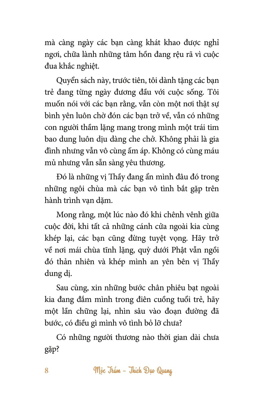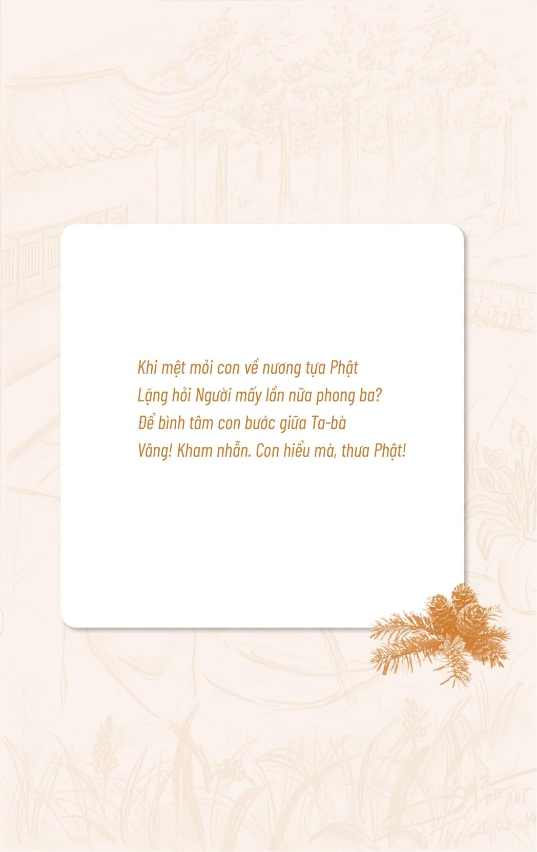 Tác giả muốn nói với các bạn rằng, vẫn còn một nơi thật sự bình yên luôn chờ đón các bạn trở về, vẫn có những con người thầm lặng mang trong m.ình một trái tim bao dung luôn dịu dàng che chở. Có thể là gia đình, người thân có thể bạn bè, và cũng có thể là những vị Thầy đang ẩn m.ình đâu đó trong những ngôi chùa mà các bạn vô tình bắt gặp trên hành trình vạn dặm.