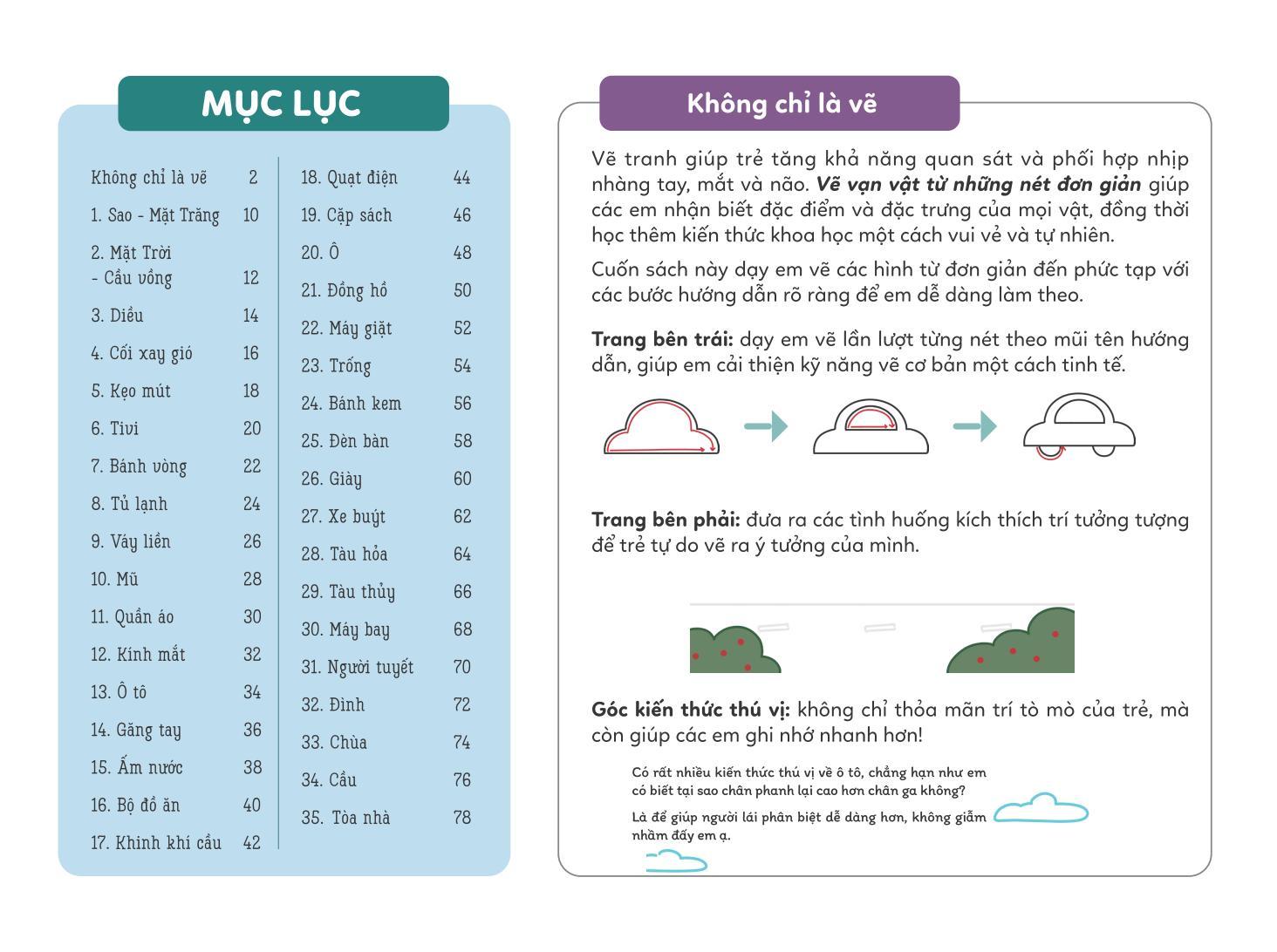Bên cạnh các bước hướng dẫn mạch lạc giúp em dễ dàng vẽ theo, mỗi cuốn sách cũng đưa ra các tình huống kích thích trí tưởng tượng để em thỏa sức sáng tạo bức tranh của riêng mình. Sách tích hợp thêm từ vựng tiếng Anh, kiến thức khoa học và thông tin bên lề thú vị giúp em khám phá thêm nhiều điều hữu ích. Vẽ vạn vật từ những nét đơn giản sẽ mang tới cho bạn nhỏ một hành trình học vẽ thật vui và ý nghĩa!