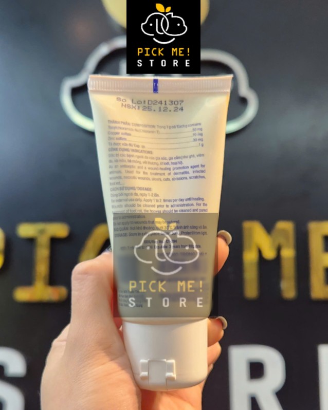 THÀNH PHẦN: Trong 1 g có chứa/Each 1 g contains: Tosylchloramide Na 50 mg (Chloramin T) Copper sulfate 70 mg Zinc sulfate 30 mg Exp. qs.... 1 g CÔNG DỤNG: Đặc trị các bệnh ngoài da của gia súc, gia cầm (như ghẻ viêm da, xà mâu, hà móng, vết thương, lở loét, hoại tử.) As an antiseptic and a wound-healing promotion agent for animals. Used for the treatment of dermatitis, infected wounds, necrotic wounds, ulcers, cuts, abrasions, scratches, foot rot,... LIỀU DÙNG: Dùng bôi ngoài da, ngày bôi 1-2 lần. For external use only. Apply 1 to 2 times per day until healing. Wounds should be cleaned prior to administration. For the treatment of foot rot, the hooves should be cleaned and pared prior to administration. BẢO QUẢN: Nơi khô thoáng, dưới 30oC, tránh ánh sáng. Store in a dry place, below 30oC. Protect from light.