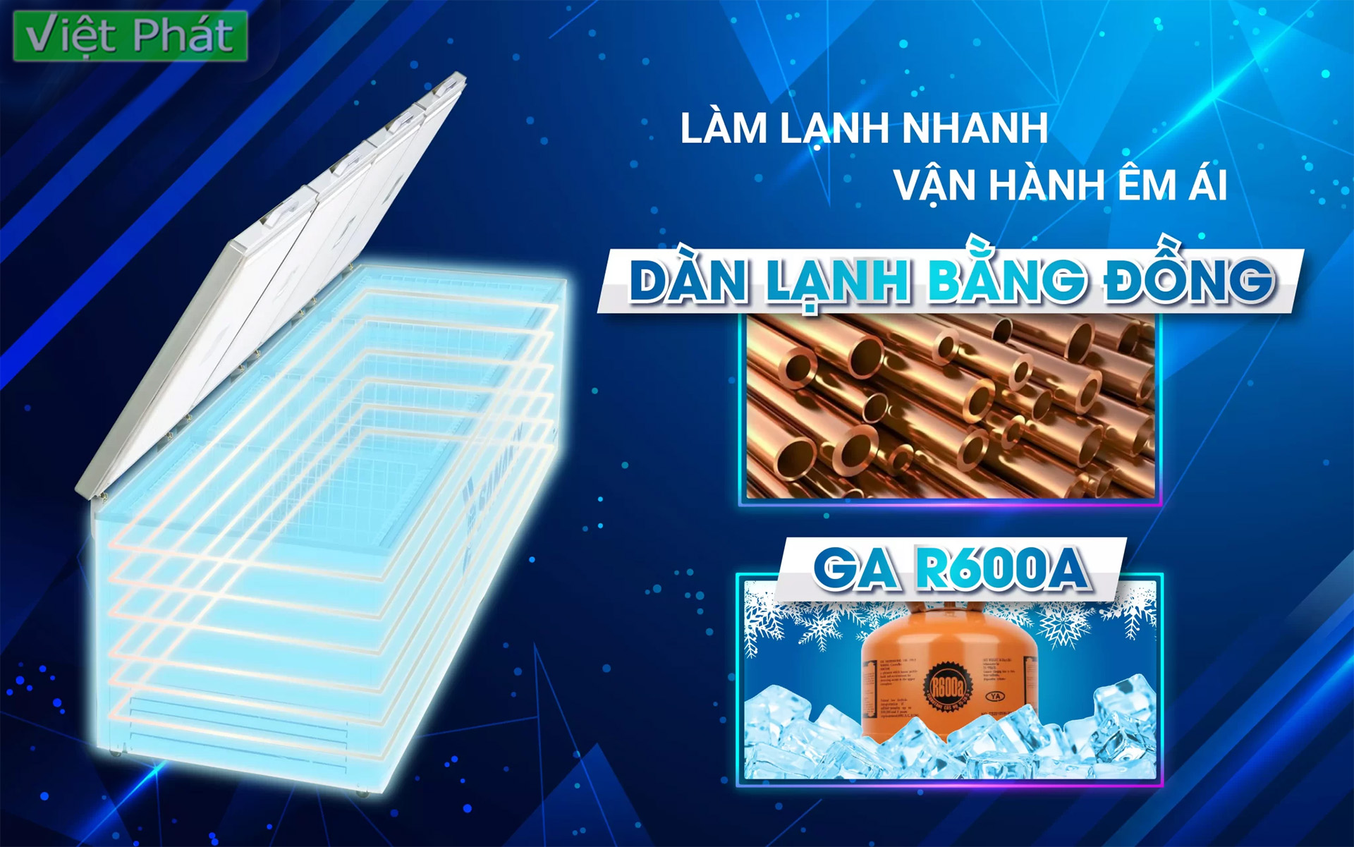 Tủ đông cấu tạo 100% dàn lạnh ống đồng nguyên chất giúp làm lạnh siêu nhanh, giữ nhiệt lâu và tiết kiệm điện