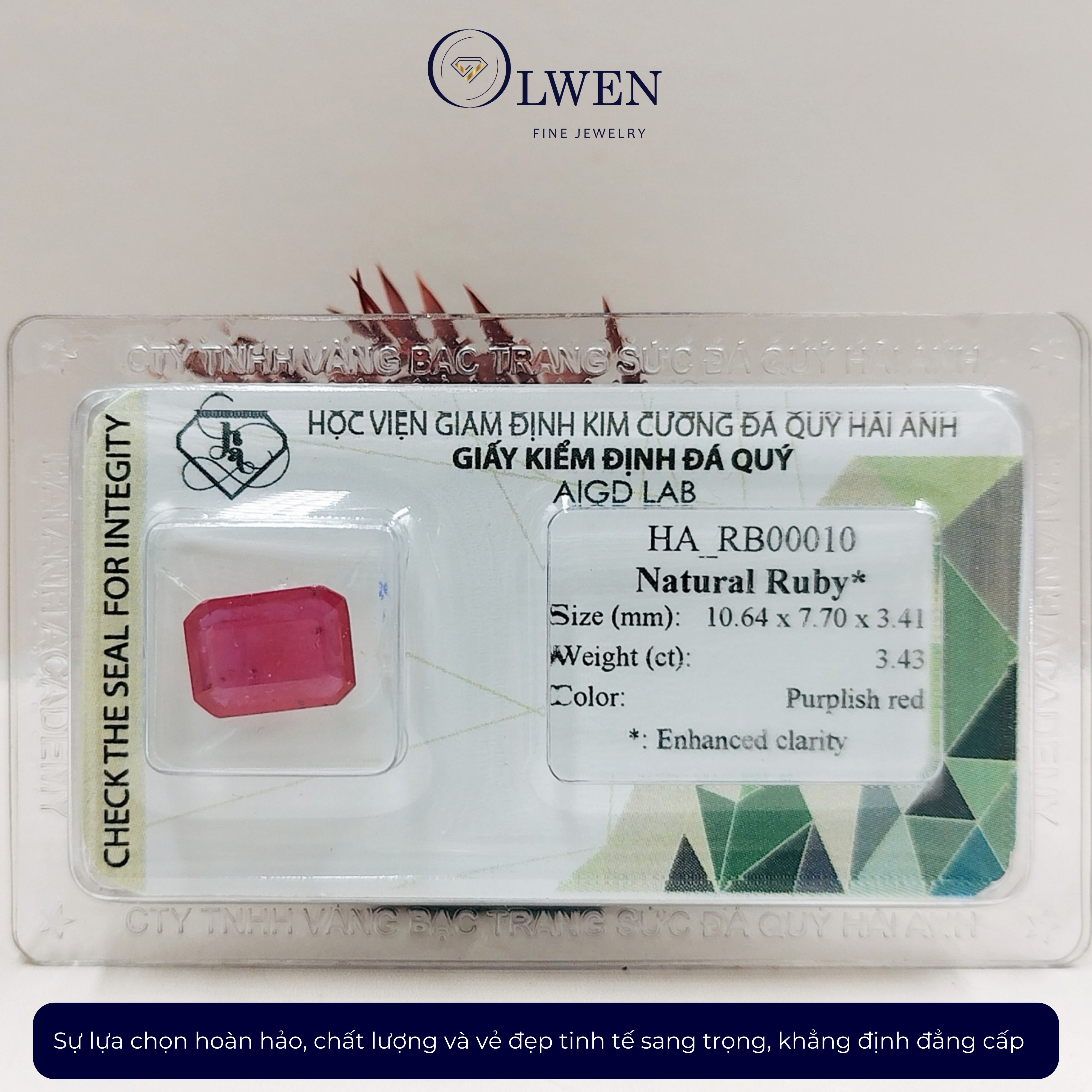 VIÊN ĐÁ RUBY THIÊN NHIÊN_HA-RB00010 Tên sản phẩm: Viên đá Ruby thiên nhiên _HA-RB00010, đá phong thủy. Kích thước: 10.64 x 7.70 x 3.41 mm Trọng lượng: 3.43 cts Màu sắc: đỏ phớt tím CÔNG