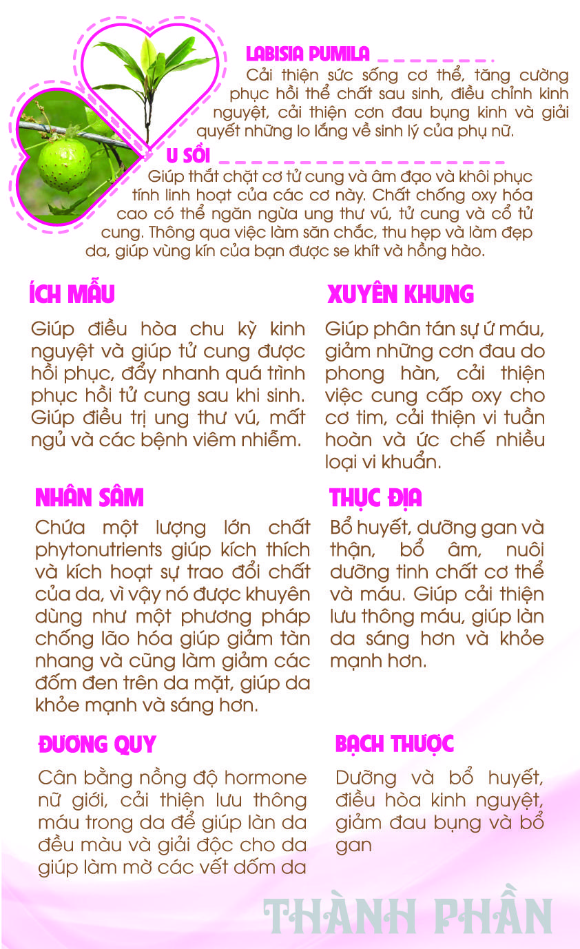 THÀNH PHẦN: Trong 1 viên chứa 985mg cao khô chiết xuất từ hỗn hợp các thảo môc Hương phụ 1400mg, Thục địa 1350mg, Bạch thược 1200mg, Đương Quy 1200mg, Ích Mẫu 1000mg, Xuyên Khung 800mg,