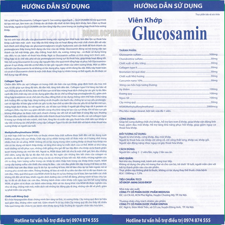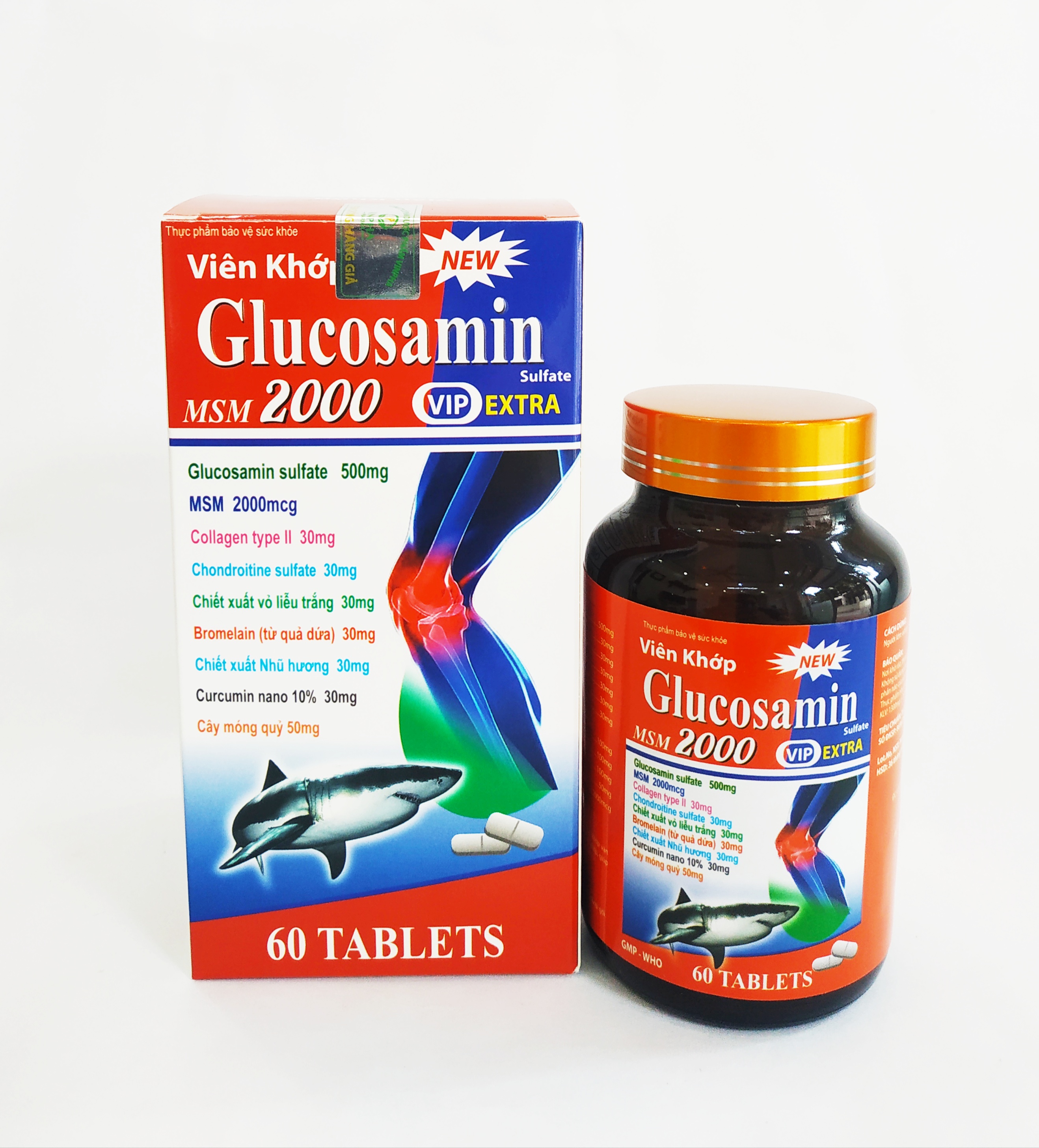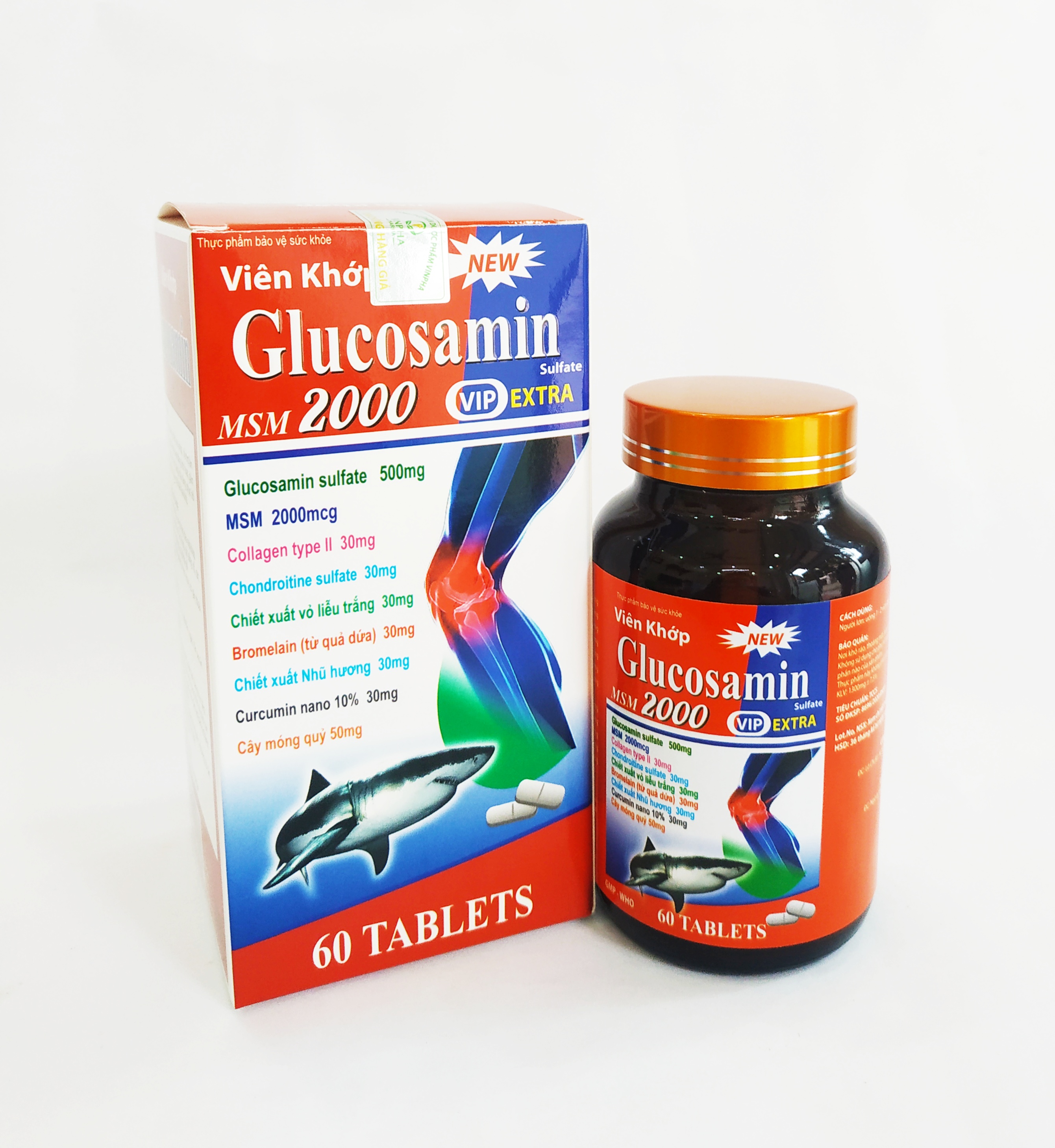 Thành phần : Trong mỗi viên nén có chứa: - Glucosamin sulphate 2 NaCl 750mg. - MSM (Methysulfonylmethane) 50mg, Calci gluconate 100mg, Cao xương ngựa bạch 70mg, Chondroitin sulphate 50mg, Collagen type II 30mg, sụn