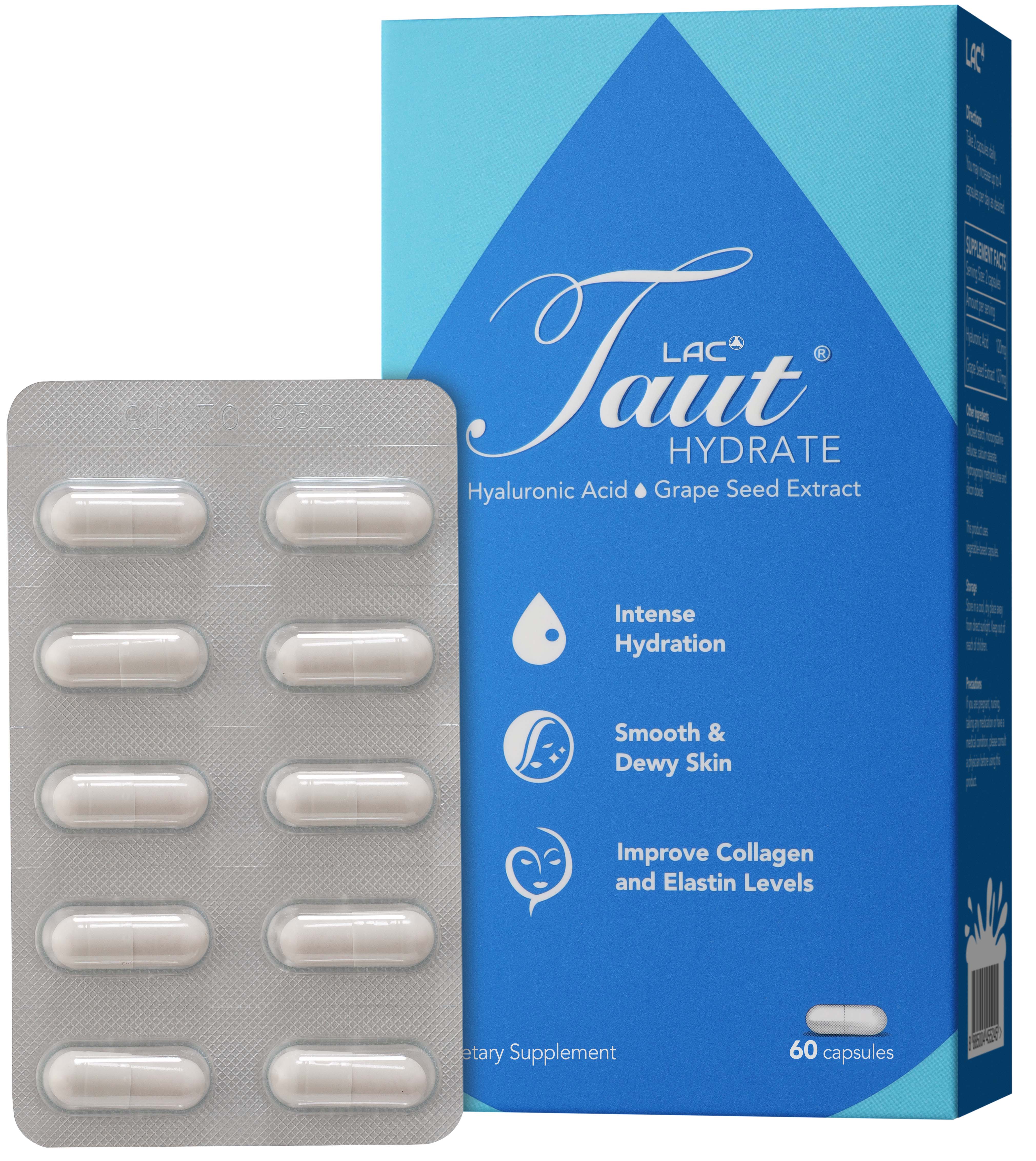 VIÊN UỐNG BỔ SUNG CHẤT DƯỠNG ẨM LAC TAUT HYDRATE (60 VIÊN) chứa dưỡng chất dưỡng ẩm cho da - Hyaluronic Acid (chất giữ ẩm) và chiết xuất hạt nho (chất chống oxy hóa) cung cấp dưỡng chất dưỡng ẩm giúp tăng cường khả năng phòng vệ chống lại tác động làm khô da cũng căng thẳng cho da do tiếp xúc với nắng nóng và máy lạnh. Giữ gìn kết cấu làn da tươi trẻ