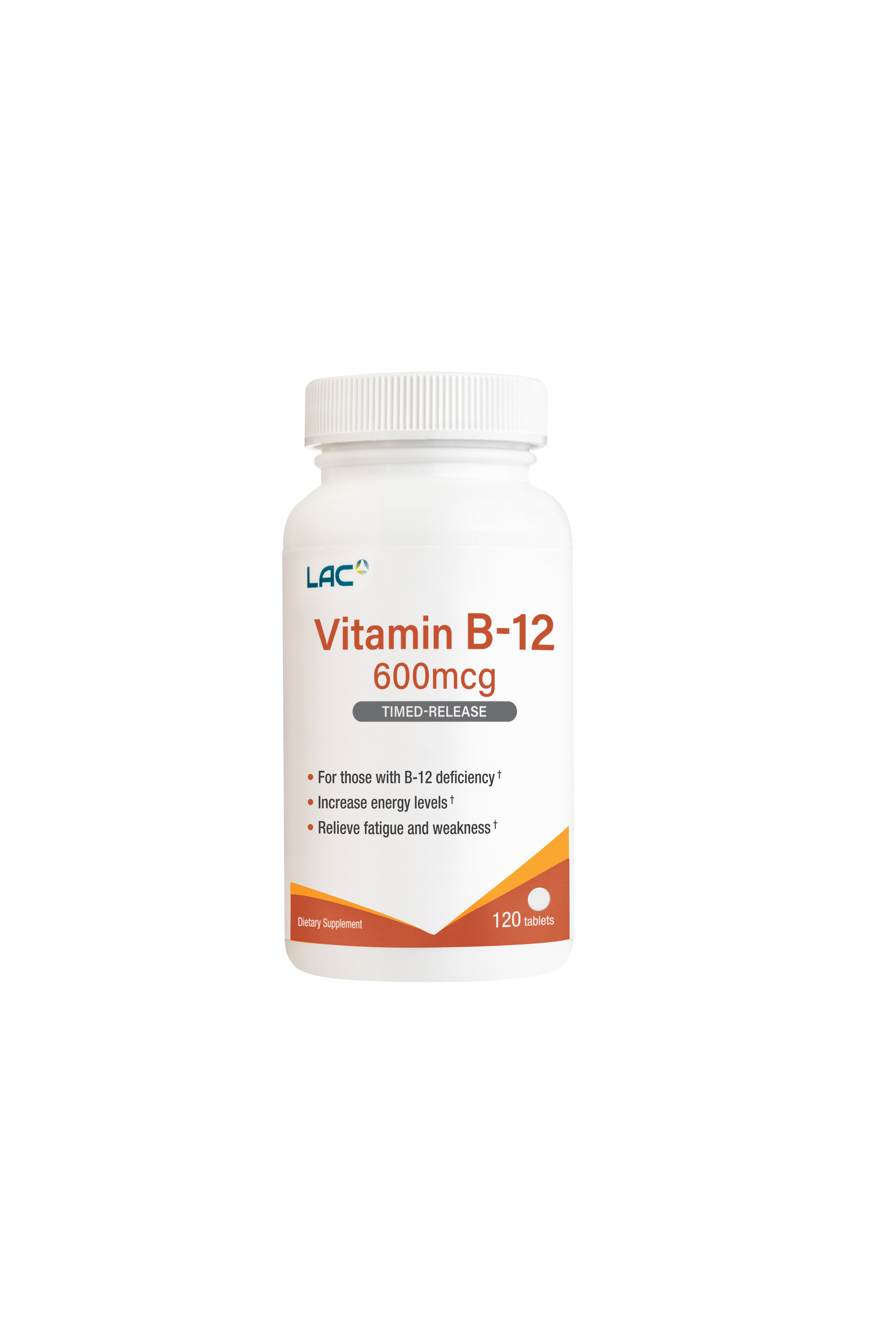 VIÊN UỐNG BỔ SUNG VITAMIN B12 GIẢM MỆT MỎI VÀ SUY NHƯỢC LAC VITAMIN B12 600MCG TIME-RELEASE (120 VIÊN) chứa 600mcg hàm lượng vitamin B12 với cơ chế giải phóng chậm giúp cơ thể hấp thụ hiệu quả hơn, tăng cường năng lượng, cải thiện sức khỏe thần kinh và chăm sóc sức khỏe toàn diện. (*) Vitamin B12, còn gọi là cobalamin, là dưỡng chất thiết yếu góp phần hình thành tế bào hồng cầu, hỗ trợ chuyển hóa tế bào, duy trì chức năng thần kinh và sản xuất DNA. Đây là thành phần quan trọng đảm bảo cơ thể hoạt động ổn định. Vitamin B-12 chủ yếu có trong các thực phẩm có nguồn gốc động vật như gia cầm, thịt, cá và các sản phẩm từ sữa. Tuy nhiên, người ăn chay hoặc thuần chay có thể gặp khó khăn trong việc bổ sung đủ B-12 do thực vật không tự nhiên chứa loại vitamin này. Thiếu hụt B-12 có thể gây ra nhiều triệu chứng, từ thiếu máu, mệt mỏi, yếu cơ, rối loạn tiêu hóa đến tổn thương thần kinh và thay đổi tâm trạng. THÔNG TIN SẢN PHẨM Công dụng 600mcg Vitamin B12 có trong mỗi viên nang giúp: