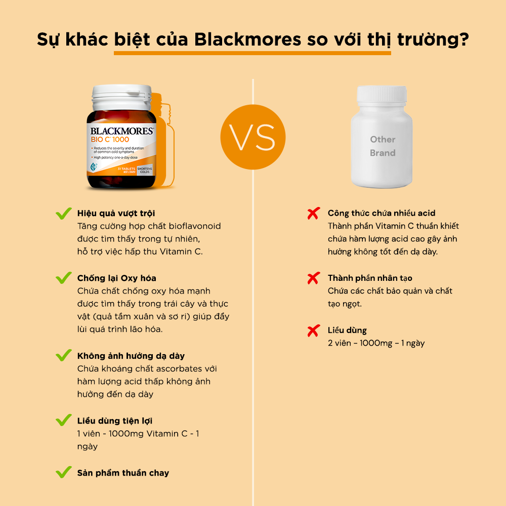 Viên Uống Blackmores Bổ Sung Vitamin C Bio C 1000mg là giải pháp lý tưởng bổ sung vitamin C hàm lượng cao, giúp bảo vệ sức khỏe. Sản phẩm có công thức muối đệm ascorbate tạo sự dịu nhẹ với dạ dày và chiết xuất citrus bioflavonoid giúp tăng cường hấp thu vitamin C. Không chỉ hỗ trợ hệ miễn dịch, viên uống còn hỗ trợ giảm nhẹ các triệu chứng cảm cúm, chống lại các tổn thương do gốc tự do và hỗ trợ mau liền vết thương….       THÔNG TIN CHI TIẾT   Thành phần: Ascorbic Acid 400mg, Sodium ascorbate 350mg, Hesperidin 50mg, Rutoside 50mg, Rosa canina extract (chiết xuất quả tầm xuân) tương đương 250mg quả khô Citrus bioflavonoids extract (chiết xuất cam, quýt, chanh) 125mg. Malpighlia punicifolia (Acerola) chiết xuất tương đương với 50mg trái khô.   Công dụng: • Bổ sung vitamin C hàm lượng cao, giúp bảo vệ sức khỏe. • Tăng sức đề kháng của cơ thể, bền thành mạch, chống chảy máu chân răng. • Hỗ trợ giảm nhẹ các triệu chứng cảm cúm, chống lại các tổn thương do gốc tự do.   Hướng dẫn sử dụng: • Người lớn dùng 1 viên hằng ngày sau bữa ăn hoặc theo chỉ định của bác sĩ. Nếu bị cảm cúm có thể tăng lên 3 viên/ngày. • Trẻ em từ 4-12 tuổi: chỉ sử dụng theo chỉ dẫn của bác sĩ.   Lưu ý: • Không dùng cho trẻ em dưới 4 tuổi nếu không có chỉ định của bác sĩ. • Phụ nữ có thai và cho con bú cần tham khảo ý khiến bác sĩ trước khi sử dụng. • Sản phẩm này không phải là ốc và không có tác dụng thay thế ốc chữa bệnh.   Hướng dẫn bảo quản • Nơi khô ráo, thoáng mát. • Tránh ánh nắng trực tiếp, nơi có nhiệt độ cao hoặc ẩm ướt. • Đậy nắp kín sau khi sử dụng.   Quy cách đóng gói: Lọ 31 viên   Xuất xứ: Úc Nơi sản xuất: Úc Ngày sản xuất: Xem trên bao bì sản phẩm Hạn sử dụng: 48 tháng kể từ ngày sản xuất   THÔNG TIN THƯƠNG HIỆU Blackmores là công ty dẫn đầu trong lĩnh vực chăm sóc sức khoẻ từ thiên nhiên của Úc được thành lập vào năm 1930. Dựa trên tầm nhìn và niềm đam mê của ông Maurice Blackmore – người sáng lập thương hiệu – Blackmores luôn nỗ lực tạo ra những sản phẩm bảo vệ sức khỏe từ các loại thảo mộc tự nhiên. Không chỉ gây ấn tượng về bề dày lịch sử và sự phát triển ổn định của công ty, Blackmores còn nỗ lực tạo ra nhiều hơn giá trị cộng đồng như bảo vệ môi trường, hỗ trợ cho cộng đồng, thúc đẩy tư duy đầu tư để có một cơ thể khỏe mạnh. Đến nay, Blackmores vẫn không ngừng nghiên cứu, tìm tòi để phát triển các sản phẩm mới nhằm mang đến sự chăm sóc tốt hơn cho sức khỏe khách hàng .