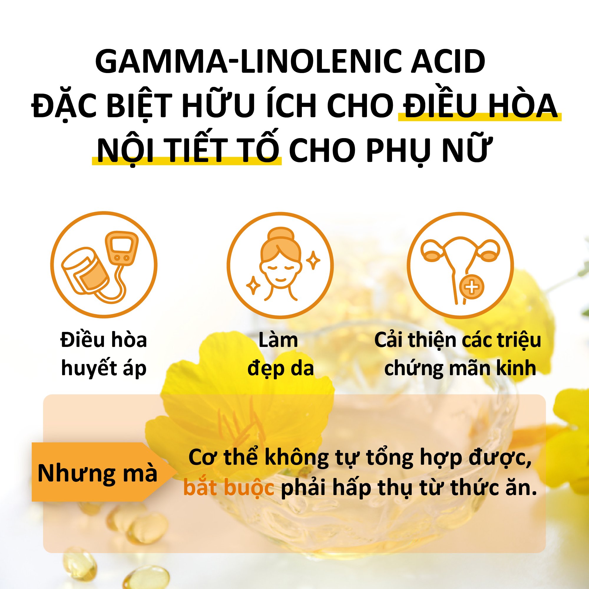 THÀNH PHẦN: mỗi viên chứa:* Hàm lượng Gamma-Linolenic acid (GLA) (103mg), tương đương với 1000mg Dầu hoa Anh Thảo (Evening Primrose Oil)* Hàm lượng Vitamin E (Alpha tocopherol) (0,75mg).  Phụ liệu: vừa đủ 1 viên CÔNG DỤNG
