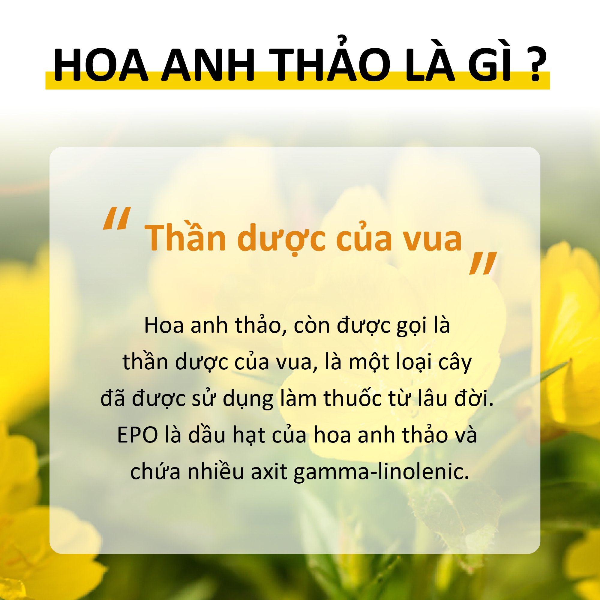 - Dầu hoa Anh Thảo (Evening Primrose) 1300mg chứa Linoleic Acid 949mg, Gamma - Linolenic Acid 117 mg.