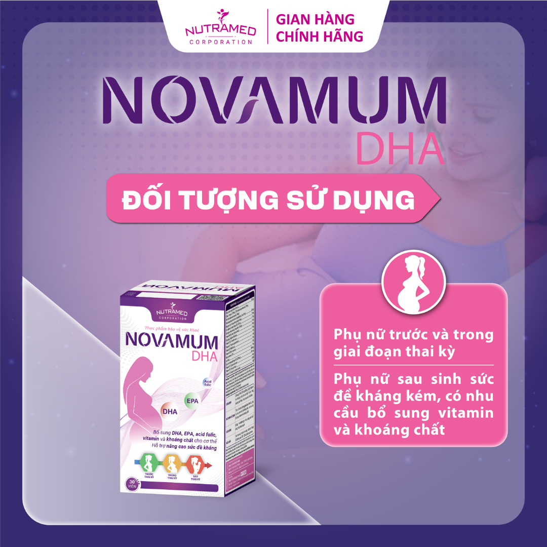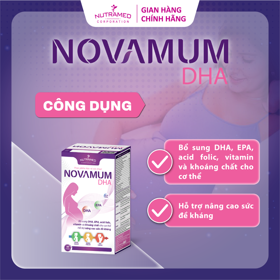 NOVAMUM DHA - Giải pháp bổ sung DHA, EPA, Acid Folic, Vitamin, Khoáng chất và hỗ trợ nâng cao sức đề kháng THÀNH PHẦN ️ Dầu cá tinh luyện, Dicalcium phosphate khan, Magnesi oxyd, Sắt carbonyl, Kẽm gluconate Vitamin B6 Bột gừng, Vitamin B5, Vitamin B1, Vitamin B2, Vitamin B3, Beta-carotene, Acid folic, Kali iodid, Vitamin B12, Vitamin D3, Vitamin E (DL-alpha tocopheryl)   CÔNG DỤNG ️ Bổ sung DHA, EPA, acid folic, một số vitamin và khoáng chất cho cơ thể, hỗ trợ nâng cao sức đề kháng.   ĐỐI TƯỢNG SỬ DỤNG ️ Phụ nữ trước và trong giai đoạn thai kỳ, phụ nữ sau sinh sức đề kháng kém, có nhu cầu bổ sung vitamin và khoáng chất.     HƯỚNG DẪN SỬ DỤNG ️ Uống 1 viên/lần/ngày. Nên uống vào buổi sáng hoặc trưa sau ăn.   KHÔNG SỬ DỤNG TRONG TRƯỜNG HỢP ️ Người mẫn cảm, kiêng kỵ với bất kỳ thành phần nào của sản phẩm.   LƯU Ý ️ Không dùng chung với các sản phẩm chứa vitamin và khoáng chất khác.  ️ Người đang dùng thuốc tham khảo ý kiến chuyên gia y tế trước khi dùng.  ️ Thực phẩm này không phải là thuốc, không có tác dụng thay thế thuốc chữa bệnh.   BẢO QUẢN  ️ Nơi khô mát, nhiệt độ không quá 30∘C, tránh ánh sáng mặt trời. Để xa tầm tay trẻ em.   THÔNG TIN SẢN PHẨM Tên sản phẩm: NOVAMUM DHA Quy cách: Hộp 3 vỉ x 10 viên Hạn sử dụng: 36 tháng Tiêu chuẩn: TCCS   _ NUTRAMED - KHƠI NGUỒN KHOA HỌC TỚI CUỘC SỐNG   Nhà máy đạt chuẩn WHO – GMP. Nguyên liệu được kiểm tra chất lượng khắt khe bởi nhà máy đạt chuẩn GMP.