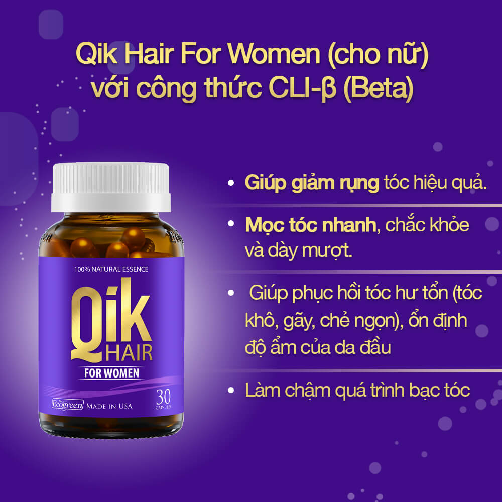 - CÔNG DỤNG Qik (For Women) với công thức chuyên biệt cho nữ giới, chứa các tinh chất thiên nhiên, giúp hỗ trợ cân bằng hệ thần kinh nội tiết và tăng trưởng tế bào mầm tóc: