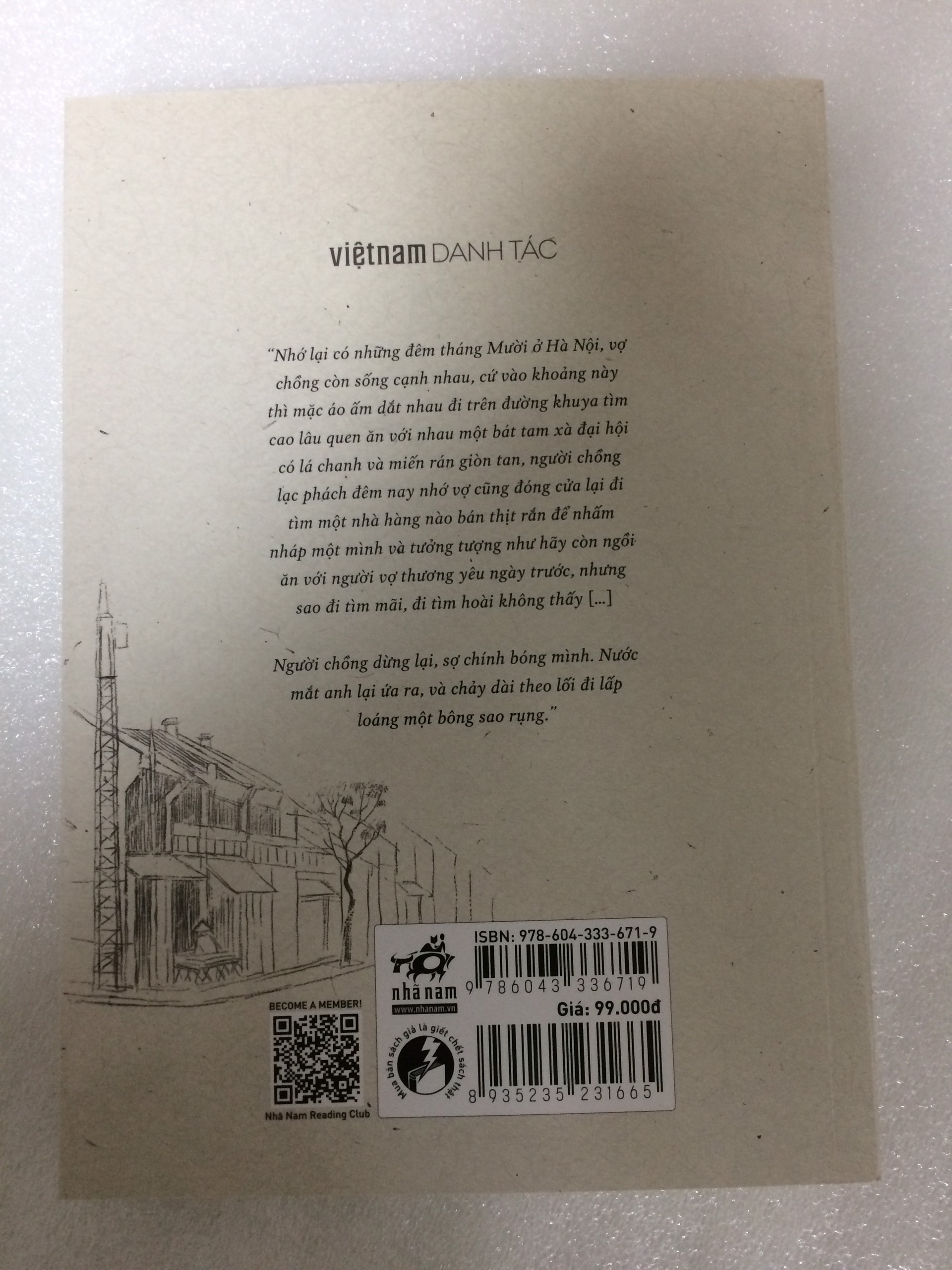 Giới thiệu sách Sơ lược về tác phẩm “Nhớ lại có những đêm tháng mười ở Hà Nội, vợ chồng còn sống cạnh nhau, cứ vào khoảng này thì mặc áo ấm dắt nhau đi trên đường khuya tìm cao lâu quen ăn với nhau một bát tam xà đại hội có lá chanh và miến rán giòn tan, người chồng lạc phách đêm nay nhớ vợ cũng đóng cửa lại đi tìm một nhà hàng nào bán thịt rắn để nhấm nháp một mình và tưởng tượng như hãy còn ngồi ăn với người vợ thương yêu ngày trước, nhưng sao đi tìm mãi, đi tìm hoài không thấy […] Người chồng dừng lại, sợ chính bóng mình. Nước mắt anh lại ứa ra, và chảy dài theo lối đi lấp loáng một bông sao rụng.”