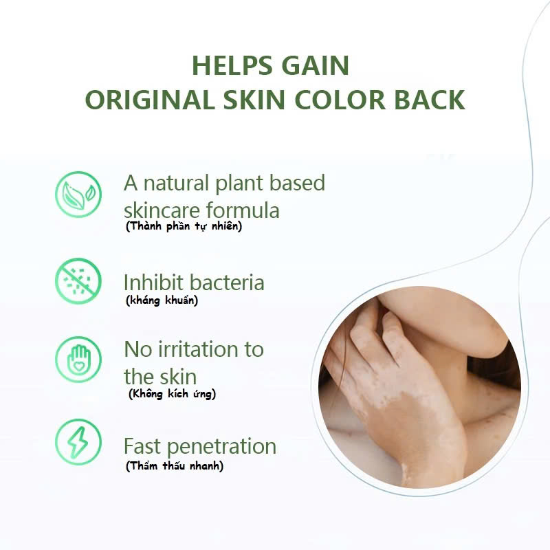 Kem thảo dược hỗ trợ bôi da bạch biến, đốm trắng Thành phần chính: Tinh chất các loại thảo dược Java brucea(Khổ sâm nam), Patrinia scabiosaefolia(Cây bại trượng), Zanthoxylum bulgeanum maxim(hoa tiêu), Stemona root(Rễ cây bách bộ), Kochia Scoparia (Địa phu), Cnidium monnier(Cây xà sàng), Axit salicylic (hay acid salicylic) không steroid, Pinellia ternata(Bán hạ bắc), Gentian, alum, …tá dược vừa đủ Đóng gói: 20gr – Tuýp niêm phong, trong hộp giấy, bao bì ghi rõ thông tin thành phần, nhà máy/ cty sản xuất, tiêu chuẩn cần đạt. Công dụng: Hỗ trợ da bị bạch biến , lang ben, đốm trắng, mồ hôi dầu, da không đồng màu Hướng dẫn sử dụng: bôi ngoài da vùng cần hỗ trợ Vệ sinh vùng da cần bôi, Lấy lượng vừa đủ kem thảo dược, Thoa và massage đều để tinh chất thấm sâu và có tác dụng ------------- ---------------- Bạch biến là một tổn thương mất tế bào sắc tố da dẫn đến vùng da bị giảm sắc tố với nhiều kích cỡ khác nhau. Nguyên nhân thường không rõ, nhưng các yếu tố di truyền và tự miễn là có thể liên quan. Chẩn đoán dựa vào khám tổn thương da. Dấu hiệu và triệu chứng bạch biến: Bạch biến ban đầu xuất hiện từ các mảnh da nhỏ, sau đó lan dần ra. Khi da tổn thương nổi rõ lên ở mặt, bàn tay, cổ tay. Thương tổn da là những đốm da mất sắc tố màu rất trắng, kích thước của các đốm cũng thay đổi từ 1 đến nhiều cm. Đốm mất sắc tố thường có hình tròn không đều, đôi khi không có hình dạng gì cả. Bề mặt da trơn láng không sưng, lông trên vùng da bệnh cũng bị bạc trắng, màu trắng của da bệnh có khi đồng nhất nhưng đôi khi loang lỗ, chỗ trắng lẫn với màu da thường. Đốm có giới hạn rõ ràng với da lành và vùng da lành quanh đốm đậm màu hơn da thường. Tuy hiếm nhưng cũng có một vài trường hợp đốm da mất sắc tố lan ra khắp người. Da, lông, tóc, toàn thân là một màu trắng. Vị trí thường nhất là mặt, phần trên của ngực, mặt lưng bàn tay, nách, háng, mắt, mũi, quanh miệng, tai, núm vú, rốn, cơ quan sinh dục ngoài. Các thương tổn da cũng thường có khuynh hướng phát triển ở vùng da bị chấn thương, bỏng. Bạch biến là một bệnh da làm mất thẩm mỹ nhưng không ảnh hưởng sức khỏe chung và tính mạng. Là một bệnh khó xử lý tuy nhiên khi đã quyết định đ.iều trị thì phải kiên nhẫn trong thời gian dài, đặc biệt khi dùng phương thức thảo dược an toàn