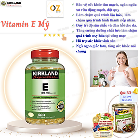 - Vitamin E Mỹ Kirkland Signature Vitamin E 180mg (400 IU) 500 Viên giúp điều trị và duy trì sức khỏe và làm đẹp da và tăng cường sức khỏe, hỗ trợ sức khỏe của hệ tuần hoàn qua việc ngăn ngừa quá trình oxi hóa cholesterol LDL, các tình trạng gây tổn thương tế bào.