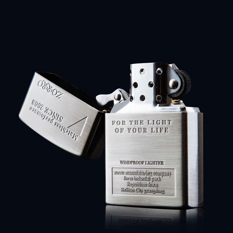 Bật lửa Zorro dùng xăng + đá (flint) Vỏ kim loại, phong cách retro, bền & dễ sửa Bật lửa Zorro dùng xăng (xăng bật lửa/chất lỏng nhẹ) kết hợp đá lửa (flint) — thiết