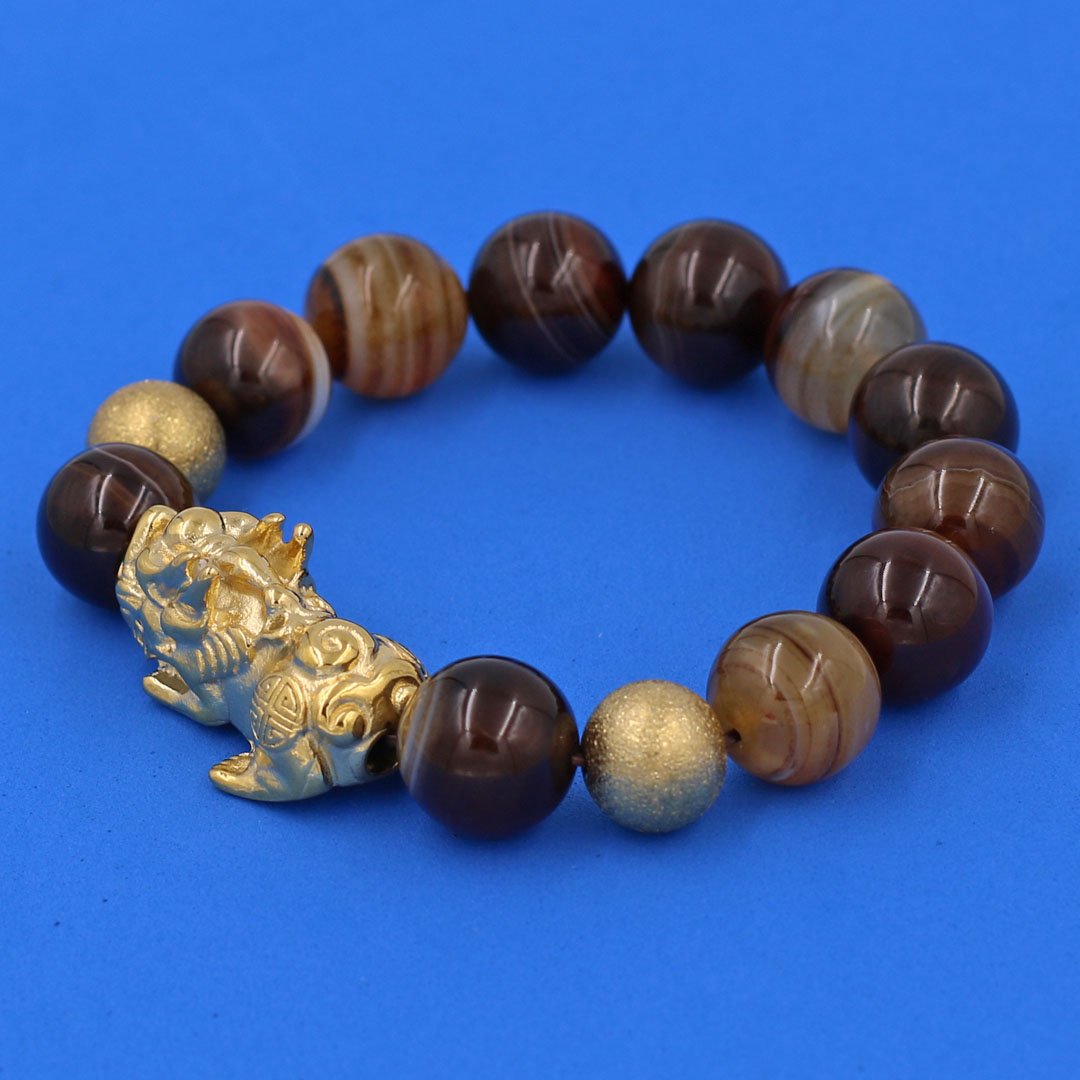 Thông tin sản phẩm : Vòng chuỗi đeo tay mã não nâu sọc 14 ly ( size lớn ) charm tỳ hưu và bi inox vàng, vòng tay chuỗi hạt