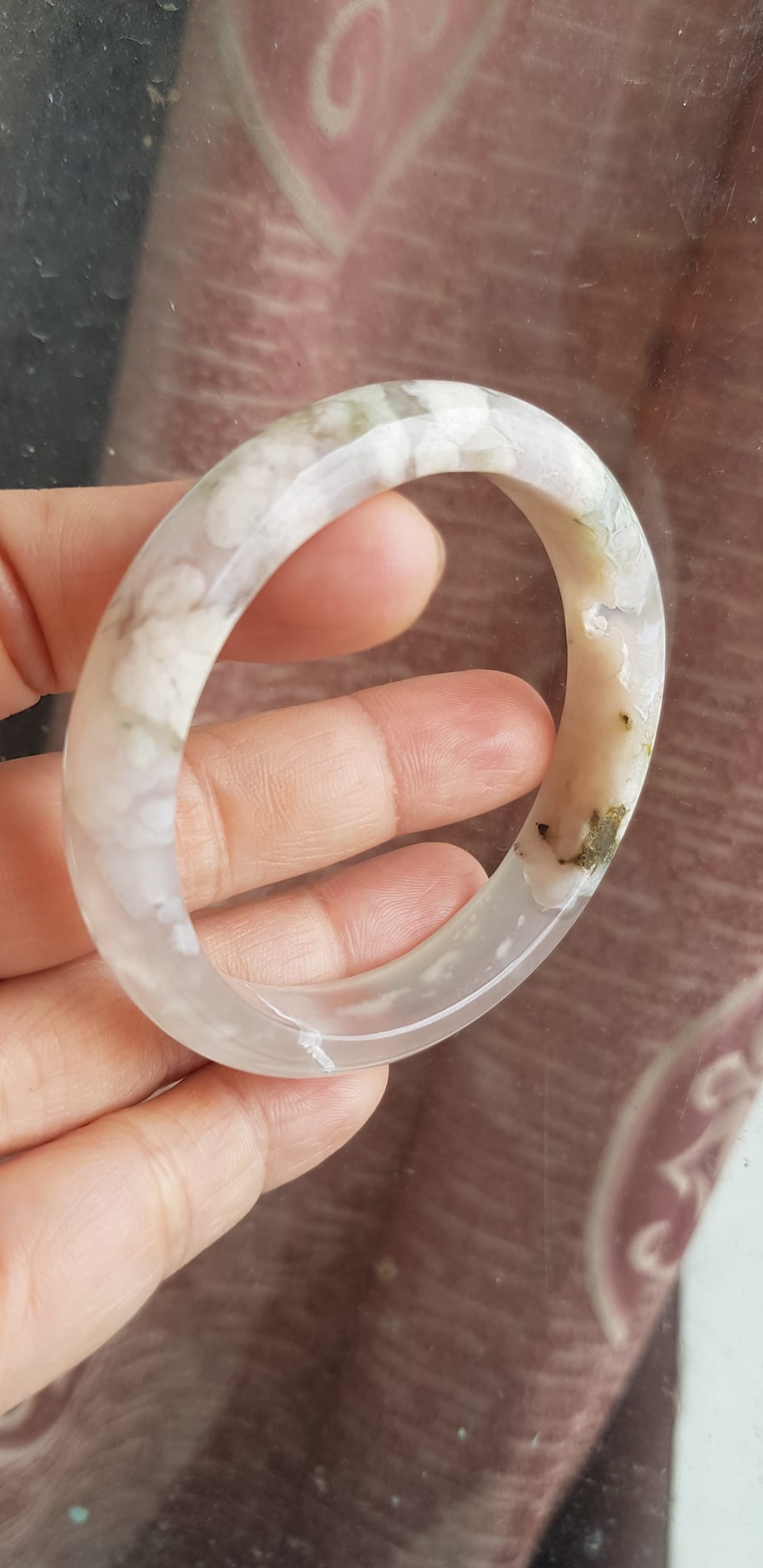 Vòng tay Nữ Bản Hẹ Mới Đá Mã Não Bông Tuyết Hồng nhẹ trắng trong bóng quá đẹp luôn ạ Ni 53mm x Cao 11mm x dầy 7mm Nữ Cân nặng 52kg - 55kg đeo