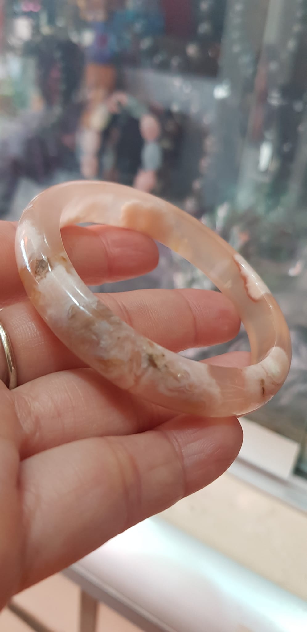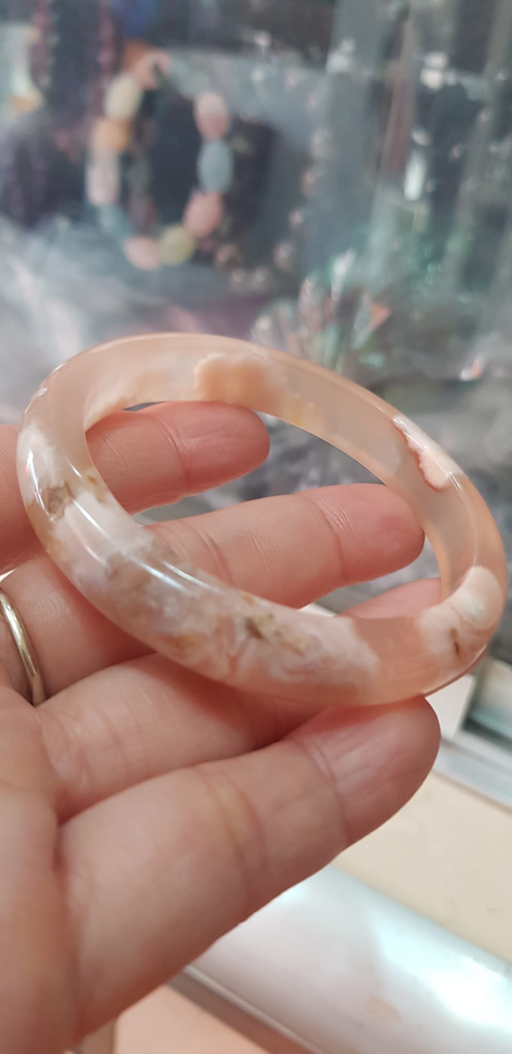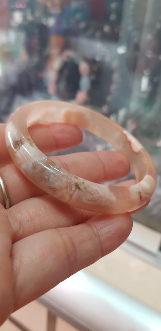 ✨Vòng tay Nữ Bản Hẹ Mới Đá Mã Não Bông Tuyết Hồng nhẹ trắng trong bóng quá đẹp luôn ạ Vòng Ni 53mm x Cao 11mm x dầy 7mm Nữ Cân nặng 52kg - 55kg đeo xinh tay đẹp lắm ạ