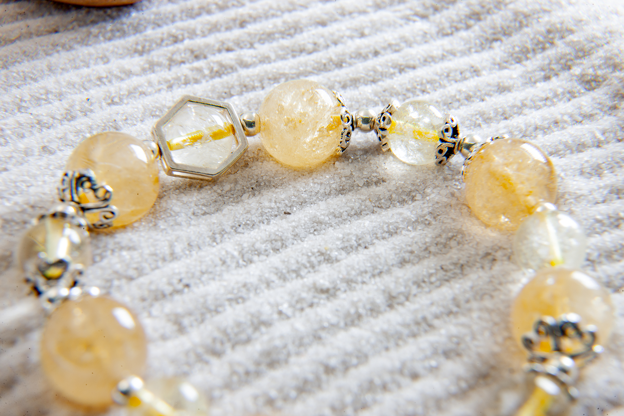 Vòng phong thủy citrine tóc vàng được biết đến như một loại đá mang lại bình an, may mắn.