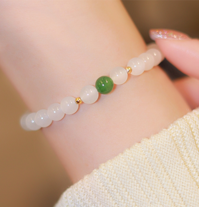 Vòng tay phong thủy đá mã não trắng mix 1 hạt đá thạch anh xanh và bi bạc dễ thương