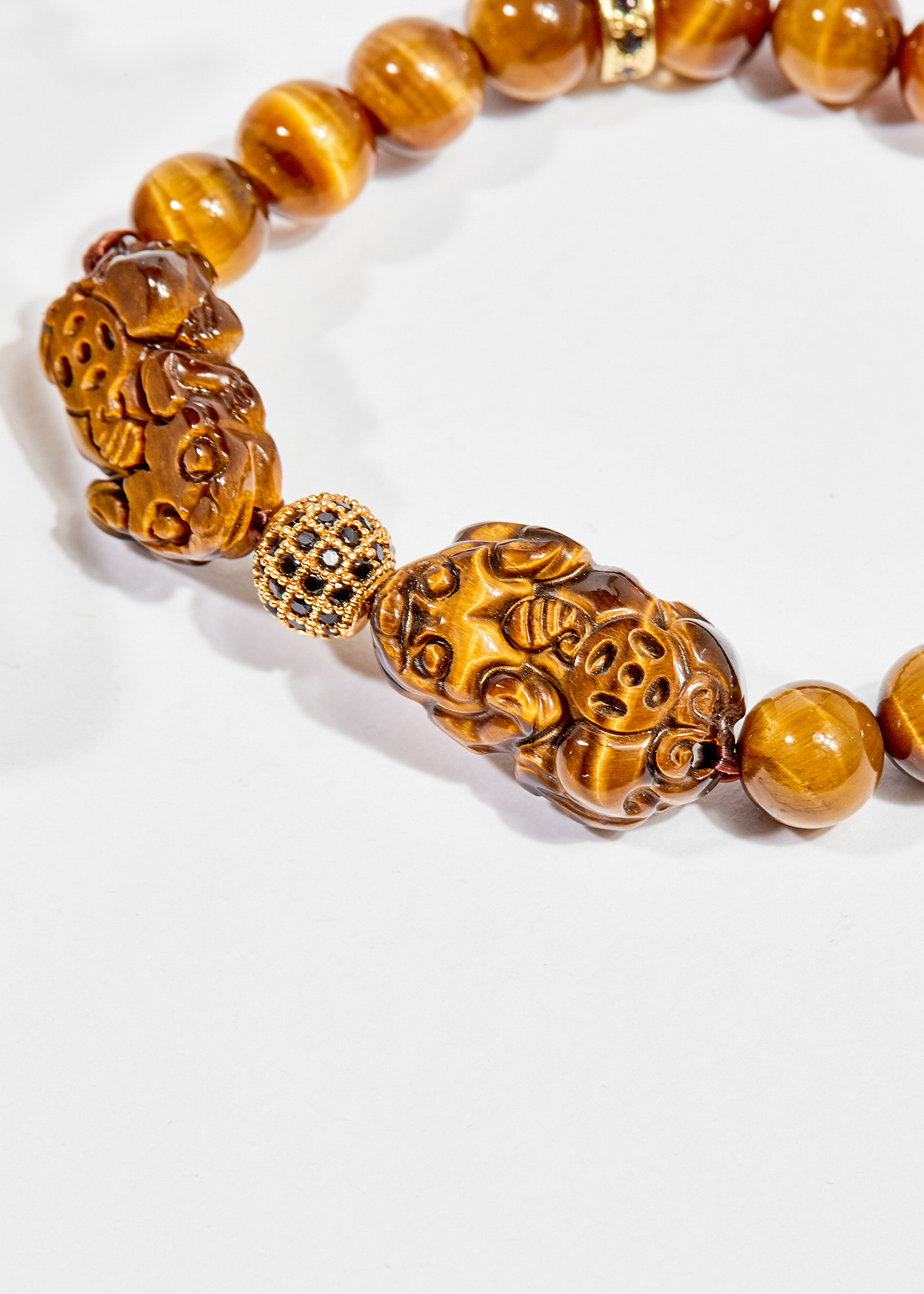 VÒNG TAY ĐÁ MẮT HỔ VÀNG NÂU CHARM TÌ HƯU: Theo truyền thuyết, Tì Hưu là linh vật đầu rồng thân lân, có sừng nhưng không có hậu môn, vì thế có khả năng thu