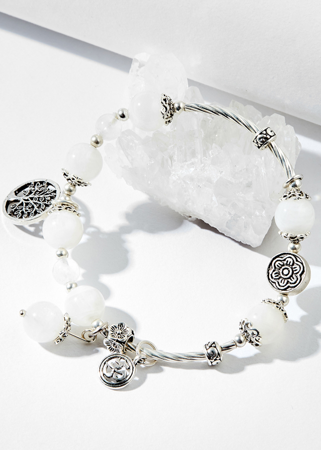 VÒNG TAY ĐÁ XÀ CỪ TRẮNG (MOONSTONE) CHARM DREAMCATCHER: Hình tròn của Dreamcatcher biểu tượng cho vòng tròn cuộc sống,như trái đất sinh mệnh, không có điểm khởi đầu cũng không có điểm kết thúc.