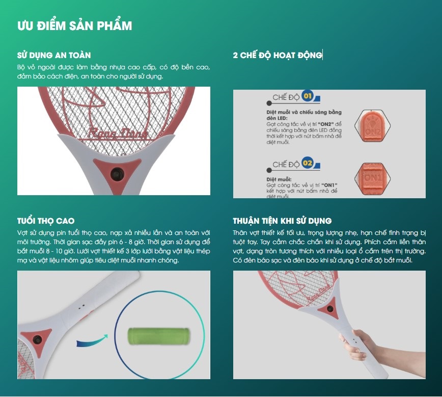 ĐẶC ĐIỂM NỔI BẬT- 3 lớp lưới giúp tiêu diệt muỗi nhanh chóng- Tích hợp đèn LED và đèn báo sạc tiện dụng- Nhựa ABS an toàn, chịu va đập- Tay cầm chống trượt- Tự