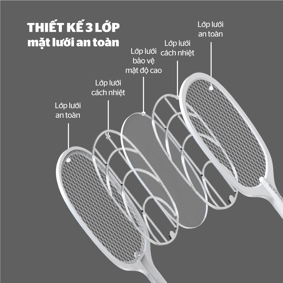 Vợt muỗi SUNHOUSE SHE-EECVM11 Đặc điểm nổi bật - 3 lớp lưới giúp tiêu diệt muỗi nhanh chóng - Tích hợp đèn báo sạc tiện dụng - Nhựa ABS an toàn, chịu va đập -