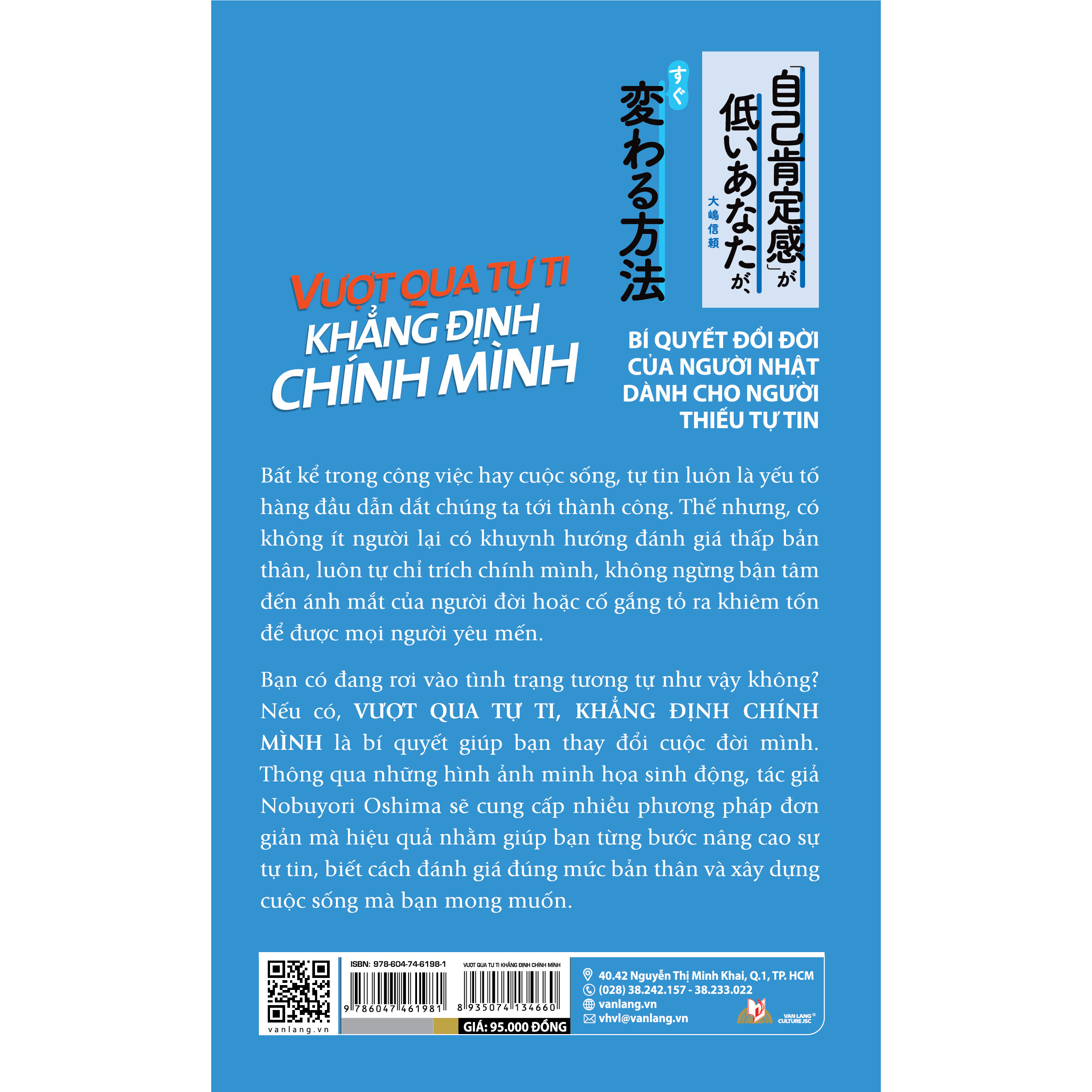 Bất kể trong công việc hay cuộc sống, tự tin luôn là yếu tố hàng đầu dẫn dắt chúng ta tới thành công. Thế nhưng, có không ít người lại có khuynh hướng đánh giá thấp bản thân, luôn tự chỉ trích chính mình, không ngừng bận tâm đến ánh mắt của người đời hoặc cố gắng tỏ ra khiêm tốn để được mọi người yêu mến. Bạn có đang rơi vào tình trạng tương tự như vậy không? Nếu có, VƯỢT QUA TỰ TI, KHẲNG ĐỊNH CHÍNH MÌNH là bí quyết giúp bạn thay đổi cuộc đời mình. Thông qua những hình ảnh minh họa sinh động, tác giả Nobuyori Oshima sẽ cung cấp nhiều phương pháp đơn giản mà hiệu quả nhằm giúp bạn từng bước nâng cao sự tự tin, biết cách đánh giá đúng mức bản thân và xây dựng cuộc sống mà bạn mong muốn .