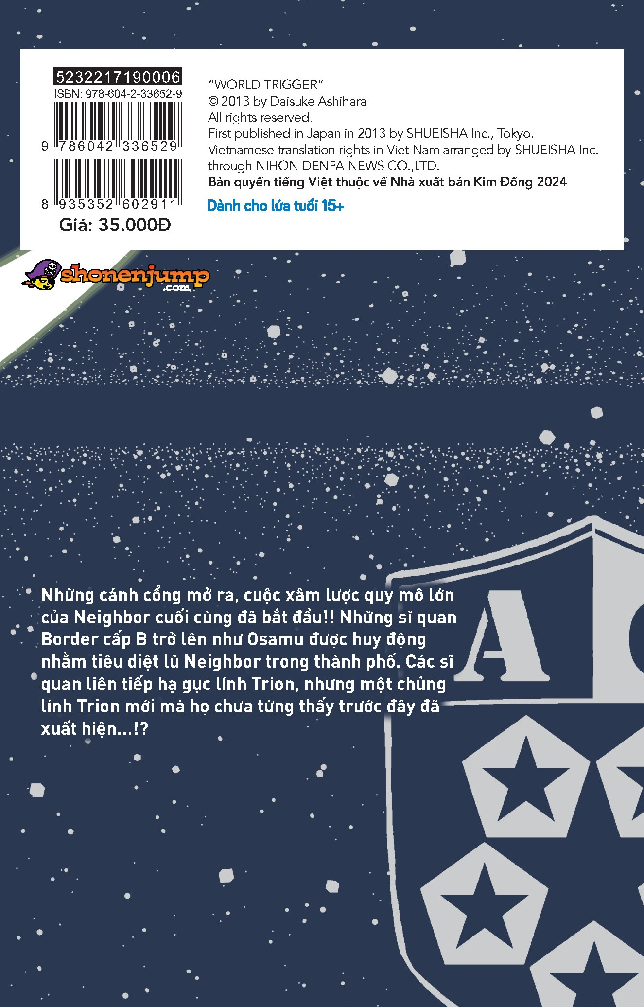 Mã hàng 8935352602911 Độ Tuổi 15+ Tên Nhà Cung Cấp Nhà Xuất Bản Kim Đồng Tác giả Daisuke Ashihara Người Dịch Yoda NXB Kim Đồng Năm XB 2024 Ngôn Ngữ Tiếng Việt Trọng lượng (gr) 210 Kích Thước Bao Bì 17.6 x 11.3 x 0.9 cm Số trang 192 Hình thức Bìa Mềm World Trigger - Tập 6 Những cánh cổng mở ra, cuộc xâm lược quy mô lớn của Neighbor cuối cùng đã bắt đầu!! Những sĩ quan Border cấp B trở lên như Osamu được huy động nhằm tiêu diệt lũ Neighbor trong thành phố. Các sĩ quan liên tiếp hạ gục lính Trion, nhưng một chủng lính Trion mới mà họ chưa từng thấy trước đây đã xuất hiện...!?