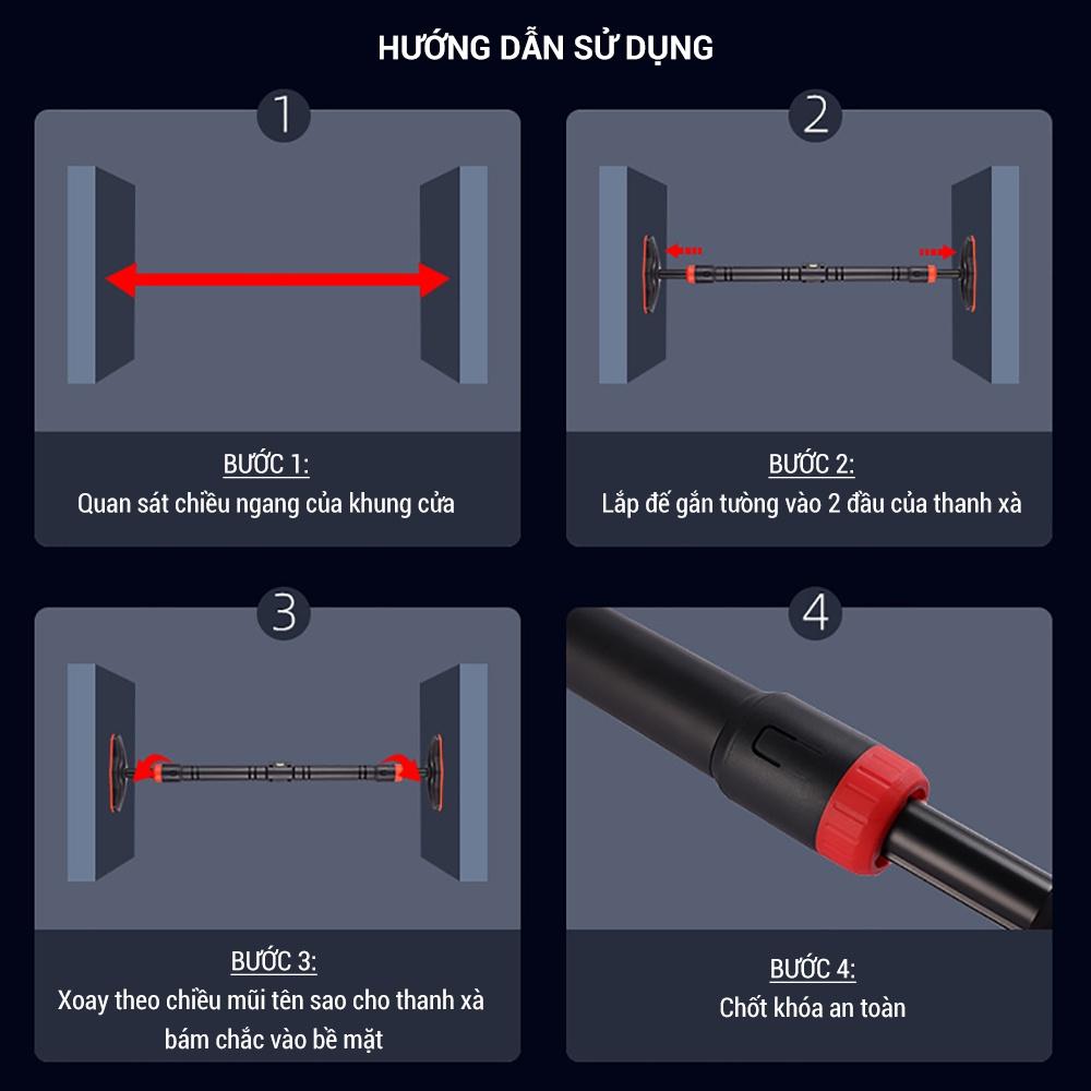 1.Các thông số kỹ thuật của xà đơn treo tường gắn cửa đen đỏ cao cấp. - Xuất xứ: Trung Quốc. - Kích thước điều chỉnh: + 60cm-110cm-(Lắp cho chiều rộng từ 60cm-85cm). + 83cm-130cm-(Lắp