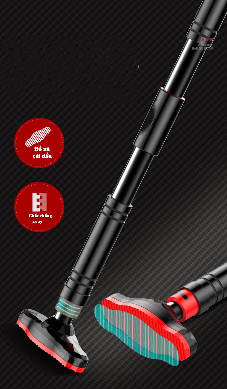 Mô Tả Sản Phẩm: Xà đơn gắn cửa cải tiến có chốt chống xoay (60cm-100cm)(82cm-130cm)(116cm-150cm) (Khách lựa chọn kích thước) Xà đơn có chốt chống xoay: Chiều dài : 62-100cm 82-130cm và 100-150cm Mẫu 62-100cm