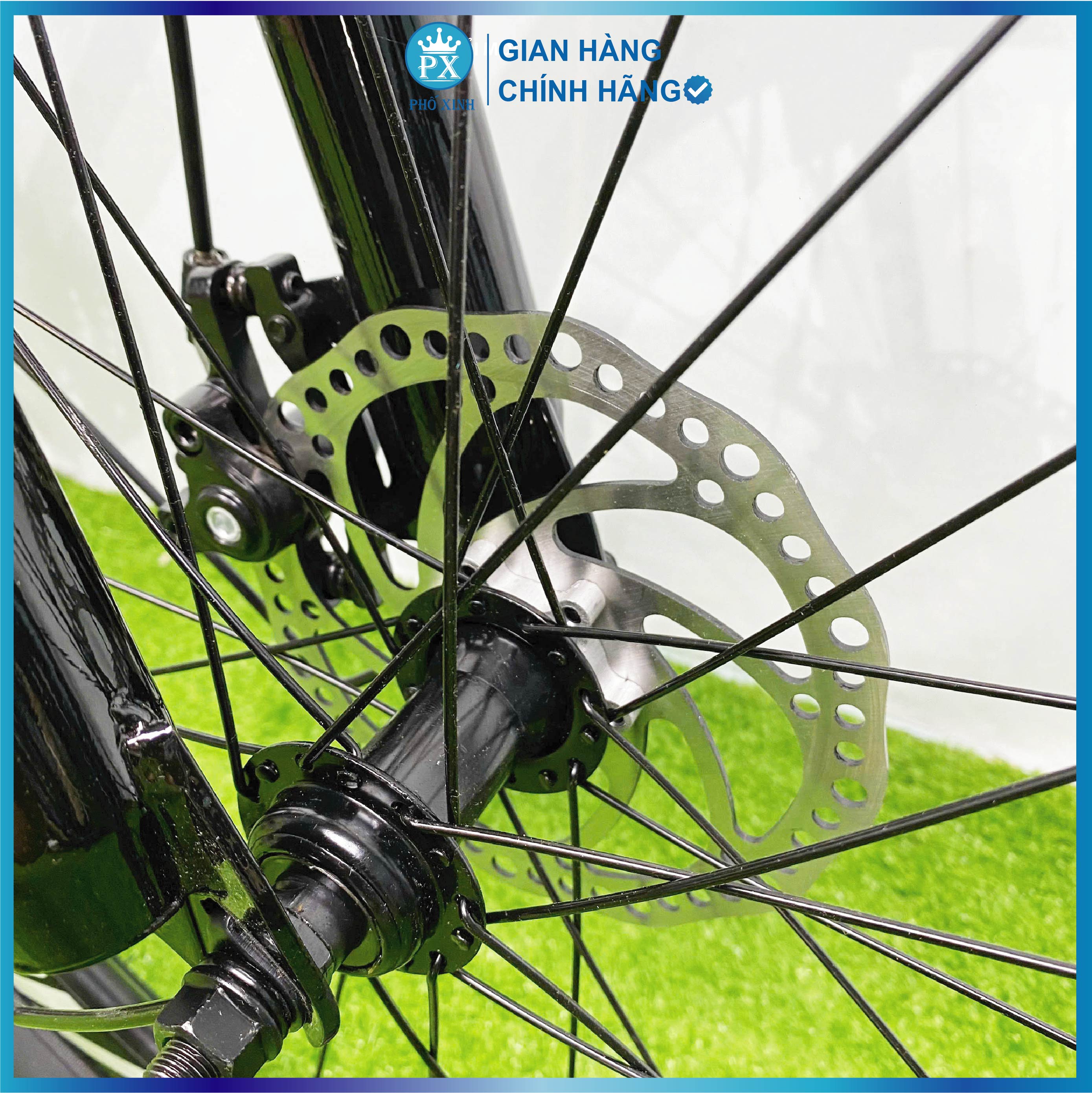 Thông số kỹ thuật: + Khung thép được hàn robot tự động đảm bảo ngấu đều chắc, an toàn tuyệt đối. + Phanh trước và phanh sau thiết kế theo dạng caliper an toàn, chính