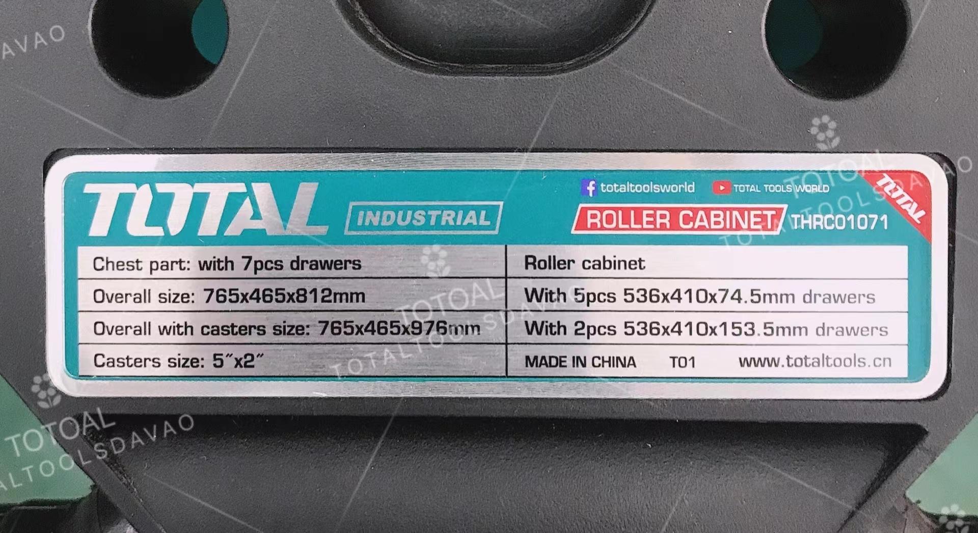 Thương hiệu đồ nghề và máy móc Total ngày càng khẳng định vị thế của mình trên thị trường, cạnh tranh thị phần với những nhãn hiệu có danh tiếng xưa giờ luôn. Total sẽ chứng minh hàng rẻ nhưng có chất lượng tốt là có thật! Total tools - Không cần bỏ số tiền lớn nhưng vẫn có cho mình những đồ nghề chất lượng. Từ những món đồ nghề đơn giản như búa, tuốc nơ vít, lục giác, cờ lê mỏ lết… được sử dụng nhiều trong gia đình cho đến những máy móc dùng điện và pin Lithium-Ion như máy khoan, máy đục bê tông, máy cưa lọng, máy cắt sắt, máy mài góc… công suất mạnh, hay được sử dụng trong nhiều ngàng công nghiệp nặng. Tất cả sản phẩm do Total sản xuất đếu khá là chất lượng và có mức giá rẻ, không như các ông lớn khác là Makita, Stanley… sản phẩm tuy tốt nhưng có giá thánh khá là đắt! Bạn thắc mắc vì sao mà công cụ - dụng cụ Total có giá rẻ ư?! Vì họ không tốn bất cứ tiền quảng cáo, quảng bá thương hiệu nào cả, từ đó mà giá thành sản phẩm rẻ! Thông số kĩ thuật -Mã sản phẩm: THRC01071 -Nhà sản xuất: Total -Với 7 ngăn kéo -Kích thước tổng thể của tủ công cụ: 765x465x812mm -Kích thước chung bao gồm bánh xe :765x465x976mm -Kích thước bánh xe lăn: 5 "* 2" -Với 5 ngăn kéo có kích thước: 536x410x74.5mm -Với 2 ngăn kéo có kích thước: 536x410x153.5mm