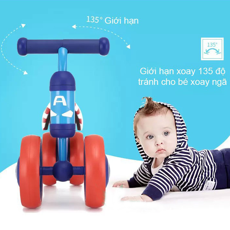 - Với 3 màu có sẵn, bố mẹ có thể dễ dàng lựa chọn phù hợp với sở thích, tính cách của con: Màu xanh kết hợp đỏ dành cho bé trai thích đội trưởng Mỹ Bản Lĩnh (Captain America) Màu vàng tinh nghịch khỏe khoắn cho bé. Màu hồng nữ tính đáng yêu cho bé gái. Chất liệu an toàn, thiết kế ngộ nghĩnh: – có thiết kế khung xe bằng kim loại không gỉ bền chắc theo thời gian sử dụng. Bề mặt xe nhẵn mịn, sơn phủ không độc hại với các góc cạnh bo tròn không sắc nhọn, không làm ảnh hưởng đến sức khỏe của trẻ. – Bánh xe được chế tạo từ nhựa đúc an toàn, cứng cáp với độ chịu lực cao, làm tăng thêm độ chắc chắn cho kết cấu xe. – Bánh xe và tay cầm bọc đệm mềm mại, êm ái, bảo vệ sức khỏe và tạo sự thoải mái khi bé lái xe. – Xe chòi chân Duke nổi bật với các màu sắc dễ thương, điệu đà và hình ảnh chú vịt ngộ nghĩnh, màu xanh sọc cờ, in trên trục lái và yên xe, chắc chắn sẽ khiến bé vô cùng thích thú khi vui chơi. Di chuyển an toàn, thoải mái: – có thiết kế ghế ngồi dài bọc đệm mềm mại mang lại cho bé cảm giác thoải mái và dễ chịu mỗi khi vui chơi. – Tay cầm vừa vặn, bọc lớp êm ái chống trơn trượt, được thiết kế nằm ngang, tương thích với chiều cao yên giúp bé điều khiển chuyển hướng xe rất dễ dàng, từ đó tăng khả năng vận động và phản xạ linh hoạt của trẻ nhỏ. – Xe chòi chân kết cấu 4 bánh hoạt động trơn tru, đặc biệt chắc chắn hơn với bánh đúp phía sau. Vành bánh xe được làm từ nhựa đúc, lốp xe đặc, mềm, chống bị đâm thủng bởi các chướng ngại vật trên đường đi. Tăng khả năng vận động của bé: – Xe chòi chân là giải pháp tốt giúp bé phát triển khả năng vận động ngay từ những năm tháng đầu đời. Thông qua động tác đẩy chân, sự điều hướng của đôi tay bé không chỉ được hỗ trợ phát triển thể lực, sự dẻo dai của hệ xương khớp mà còn rèn luyện cho bản thân khả năng nhanh nhạy, nhạy bén, từ đó tác động tích cực tới sự phát triển của tư duy và não bộ sau này. – Với Xe chòi chân – Tập cân bằng 4 bánh cao cấp, giờ đây bé cùng bạn bè có thể cùng nhau tạo nên một cuộc đua gay cấn để có được những giờ phút vui chơi vận động thật thư giãn và sảng khoái. Thông tin kích thước: – Kích thước xe (D x R x C): 50 x 21 x 35 cm. – Đường kính bánh xe: 15 cm – Chiều cao yên ngồi: 21 cm – Chiều dài tay cầm: 21 cm.