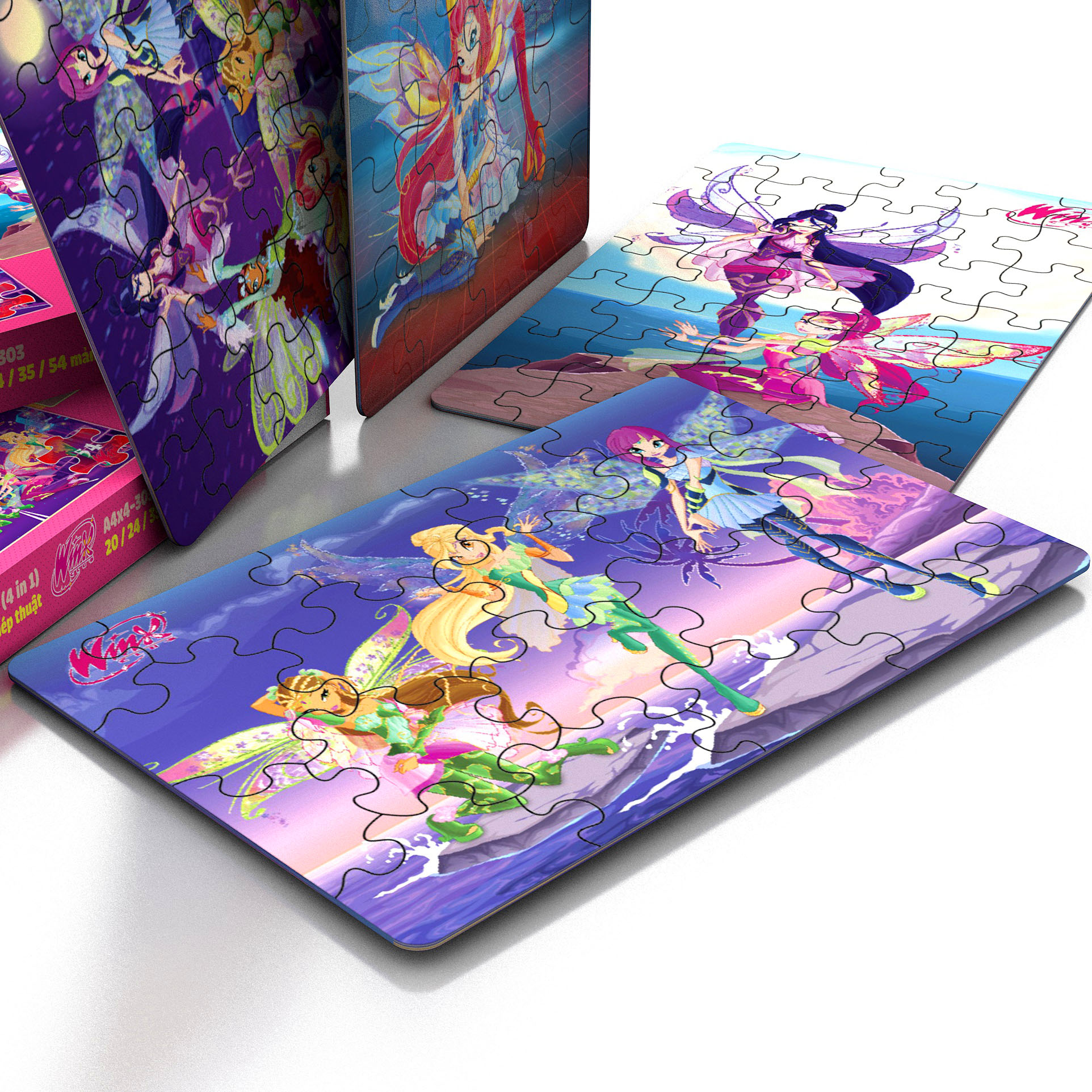 Xếp hình A4 - 4 trong 1 : WinX Có 4 tranh kích thước 20x30 cm, với số mảnh có độ khó tăng dần: 20-24-35-54 mảnh Tuổi chơi thích hợp : 3+ đến 10+ Mảnh