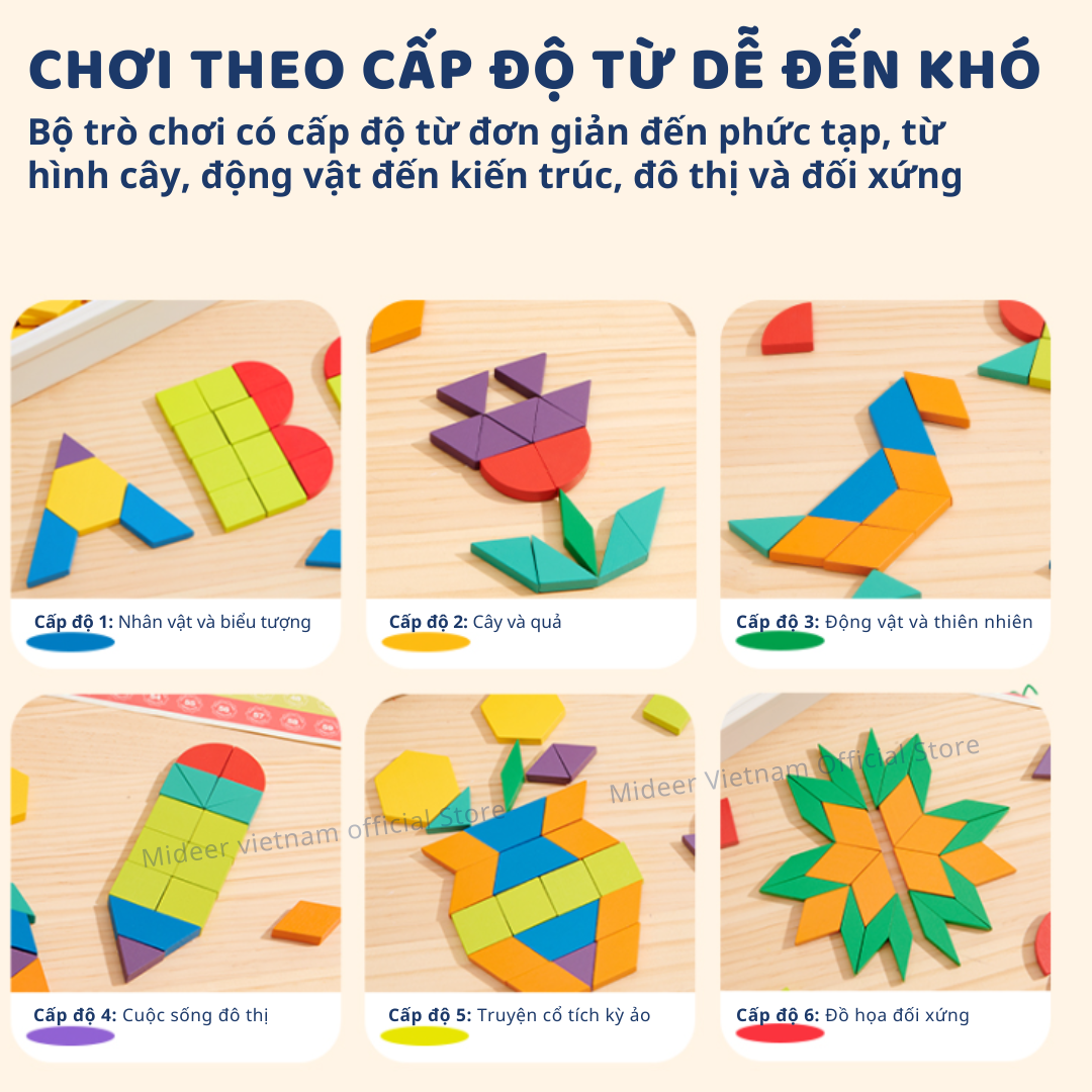 - CHƠI THEO CẤP ĐỘ TỪ DỄ ĐẾN KHÓ: Bộ trò chơi có các cấp độ chơi từ đơn giản đến nâng cao, từ các hình đơn giản như cây cối, động vật, đến các mô hình phức tạp như kiến trúc, cuộc sống đô thị và những hình ảnh đối xứng.