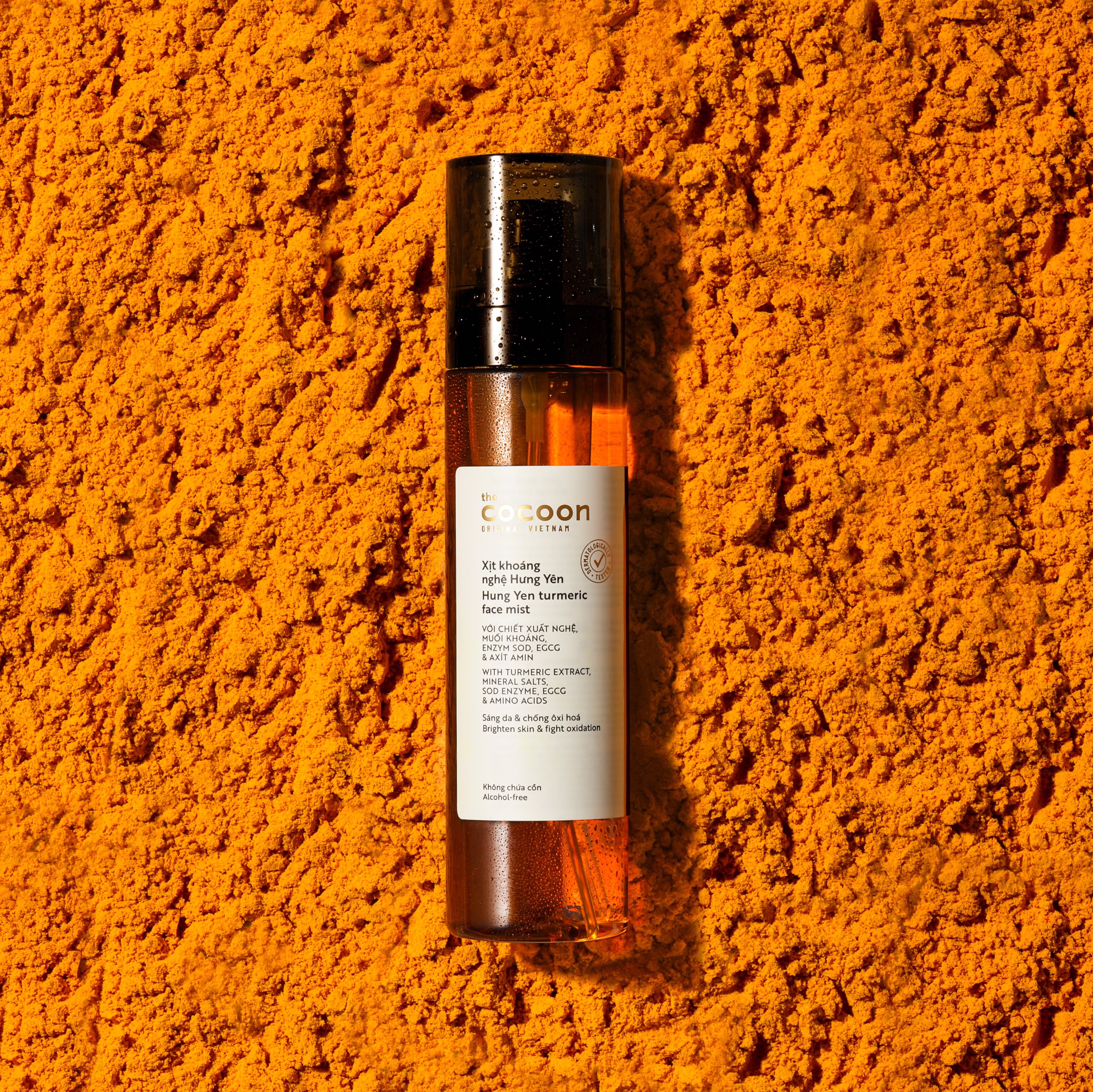 Một lớp sương mịn từ chiết xuất củ nghệ, muối khoáng kết hợp cùng enzym SOD, EGCG và các axit amin sẽ bao phủ làn da giúp cấp ẩm tức thời, giúp làm sáng, chống oxi hóa mạnh mẽ và bảo vệ da khỏi các tác nhân gây hại từ môi trường. XỊT KHOÁNG NGHỆ HƯNG YÊN COCOON THUẦN CHAY KHÔNG VÀNG DA. Công dụng Xịt khoáng nghệ Hưng Yên cocoon