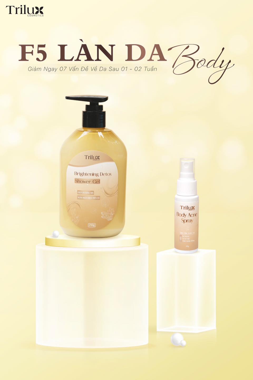 THÔNG TIN SẢN PHẨM: Xịt Mụn Body Trilux: Mỗi lần xịt là một lần làn da được gi.ải cứ.u khỏi tình trạng mụn. Với sự kết hợp của BHA, tinh dầu tràm trà, và chiết xuất lá neem, sản phẩm giúp làm sạch lỗ chân lông, hỗ trợ gi.ảm viêm mụn và làm dịu da. Xịt mụn này hỗ trợ mờ thâm, giúp da trở nên đều màu và khỏe mạnh hơn. THÀNH PHẦN SẢN PHẨM: