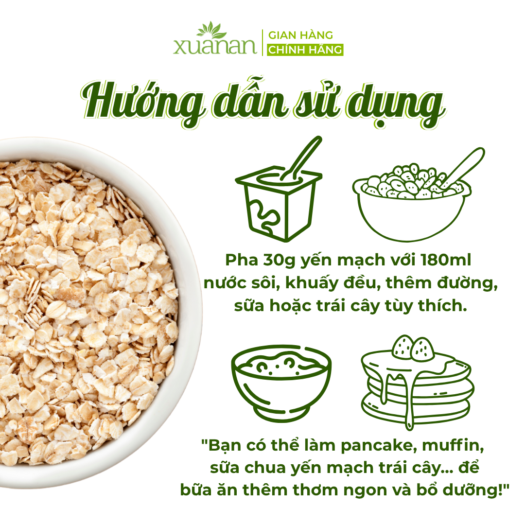 Pha 30 g yến mạch nguyên chất với 180 ml nước thật sôi, khuấy đều trước khi dùng, có thể thêm đường, sữa (sữa bột, sữa tươi), hoặc trái cây tuỳ theo sở thích.